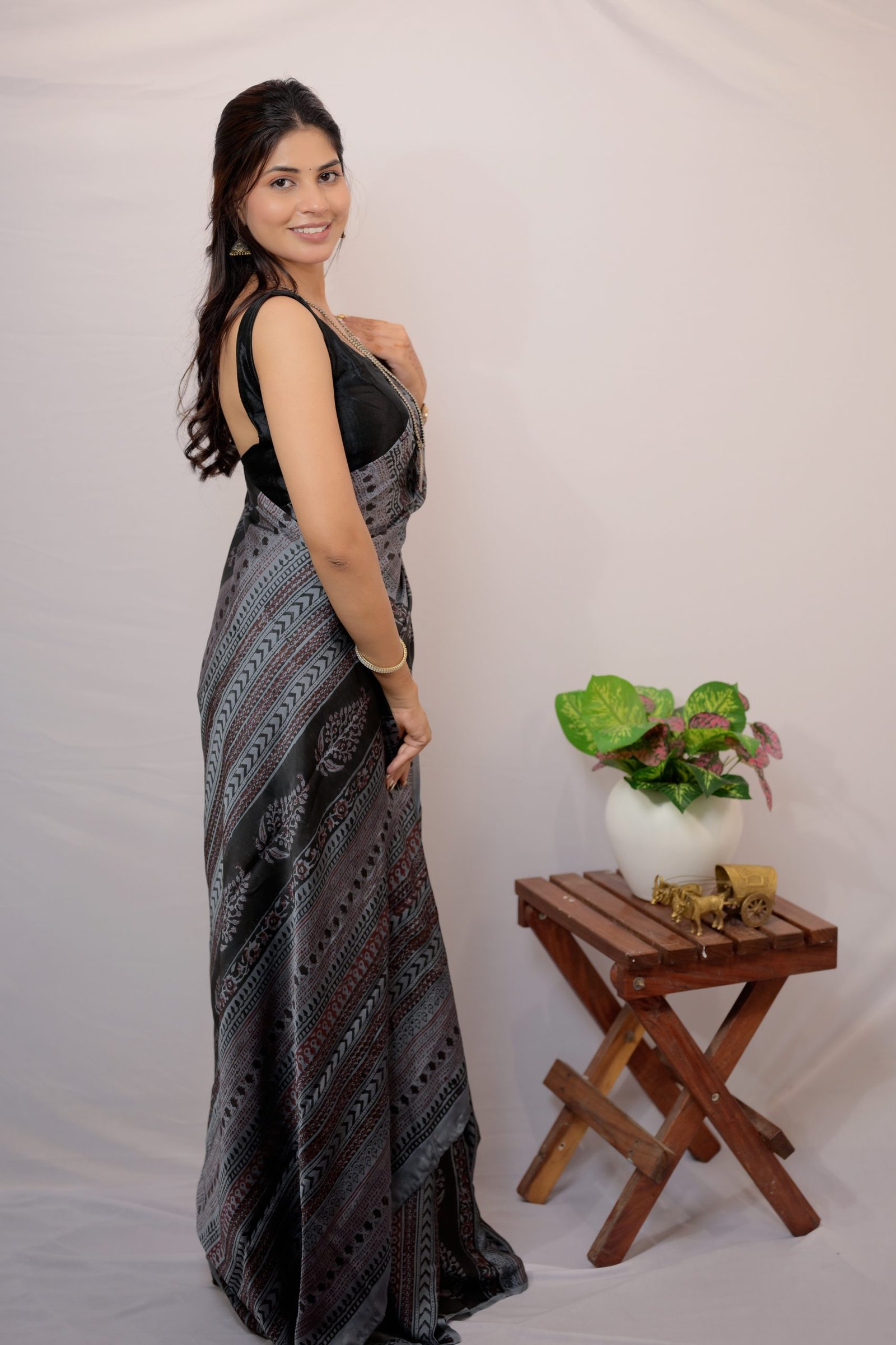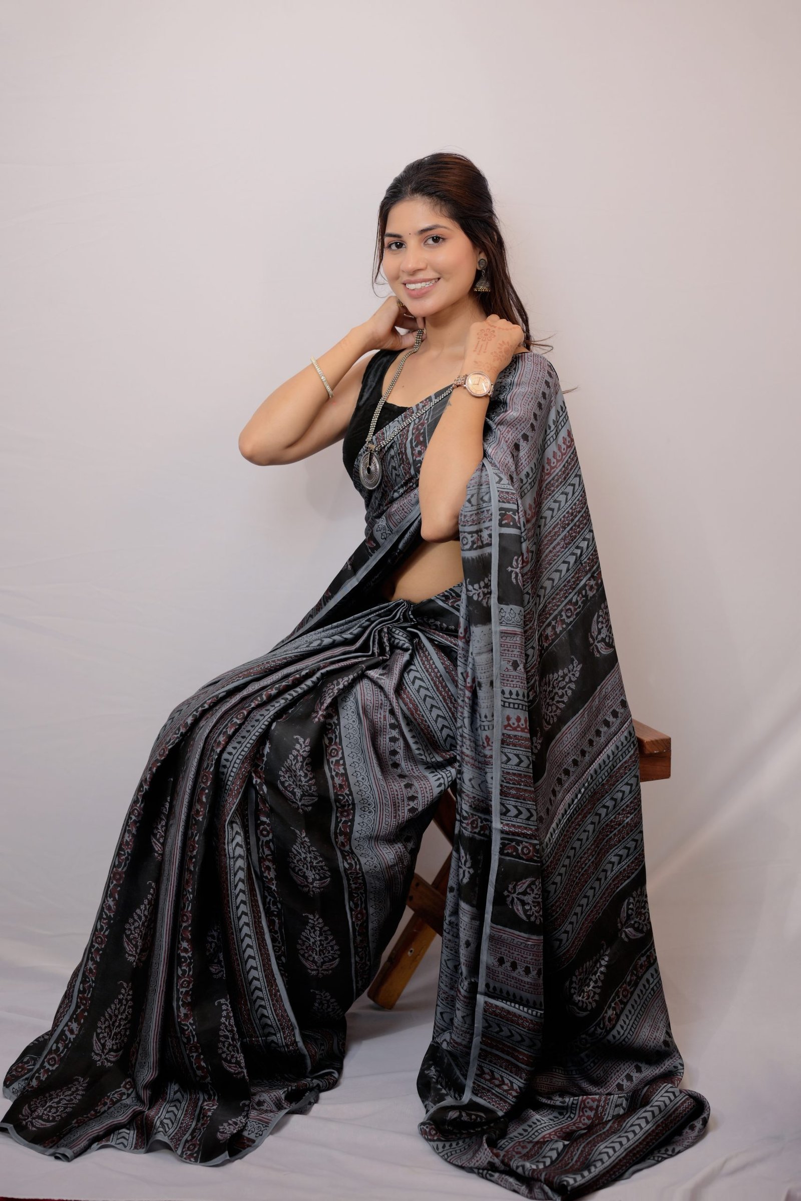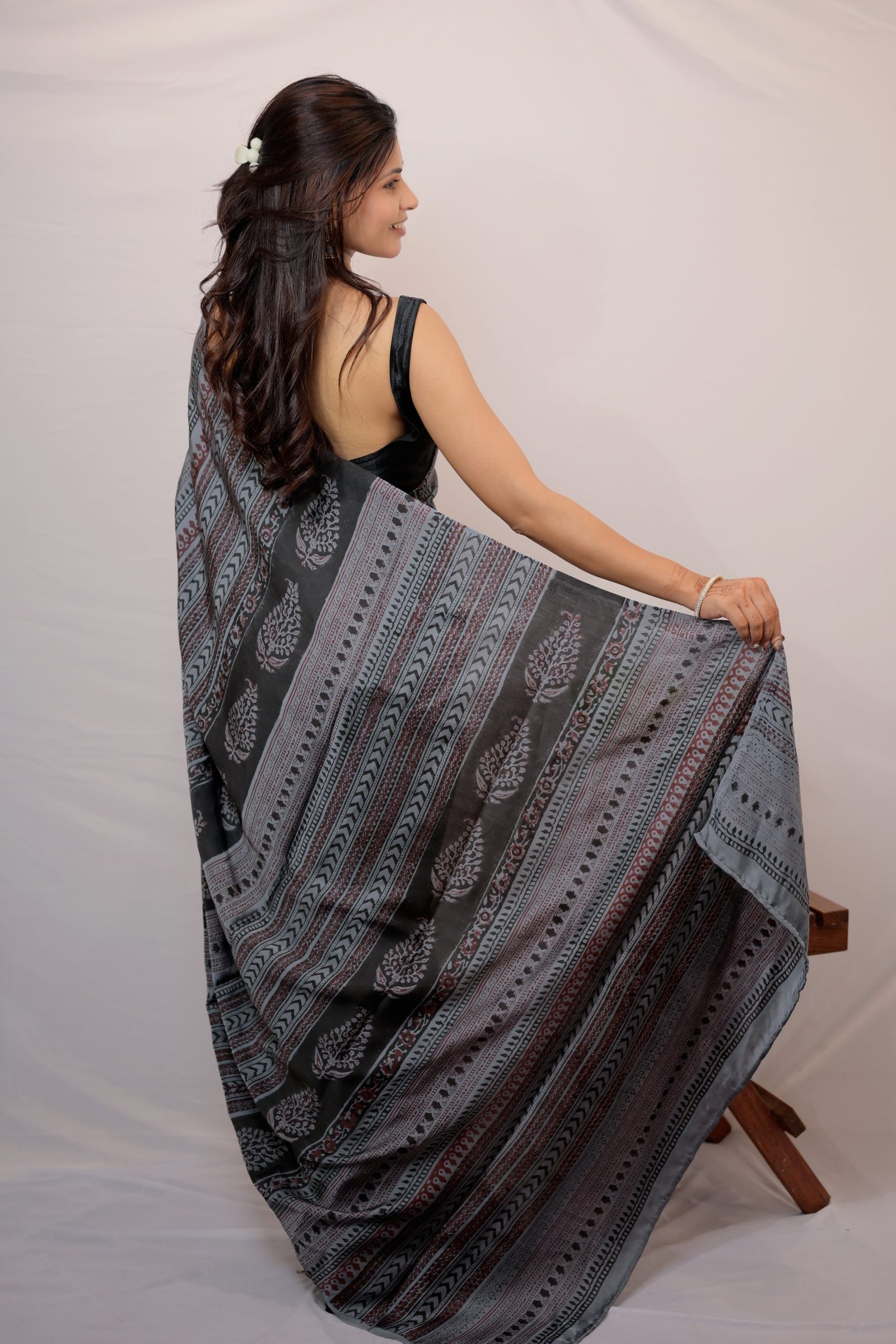 The Bhairongarh print Modal Silk Saree has grey base and is beautifully complemented with red and black prints, giving the saree a beautiful grace. The vertical borders give an elegant pose to the saree. Designed in standard size with a matching blouse piece, it drapes gracefully and is ideal for festive occasions, weddings, office parties, or cultural gatherings.