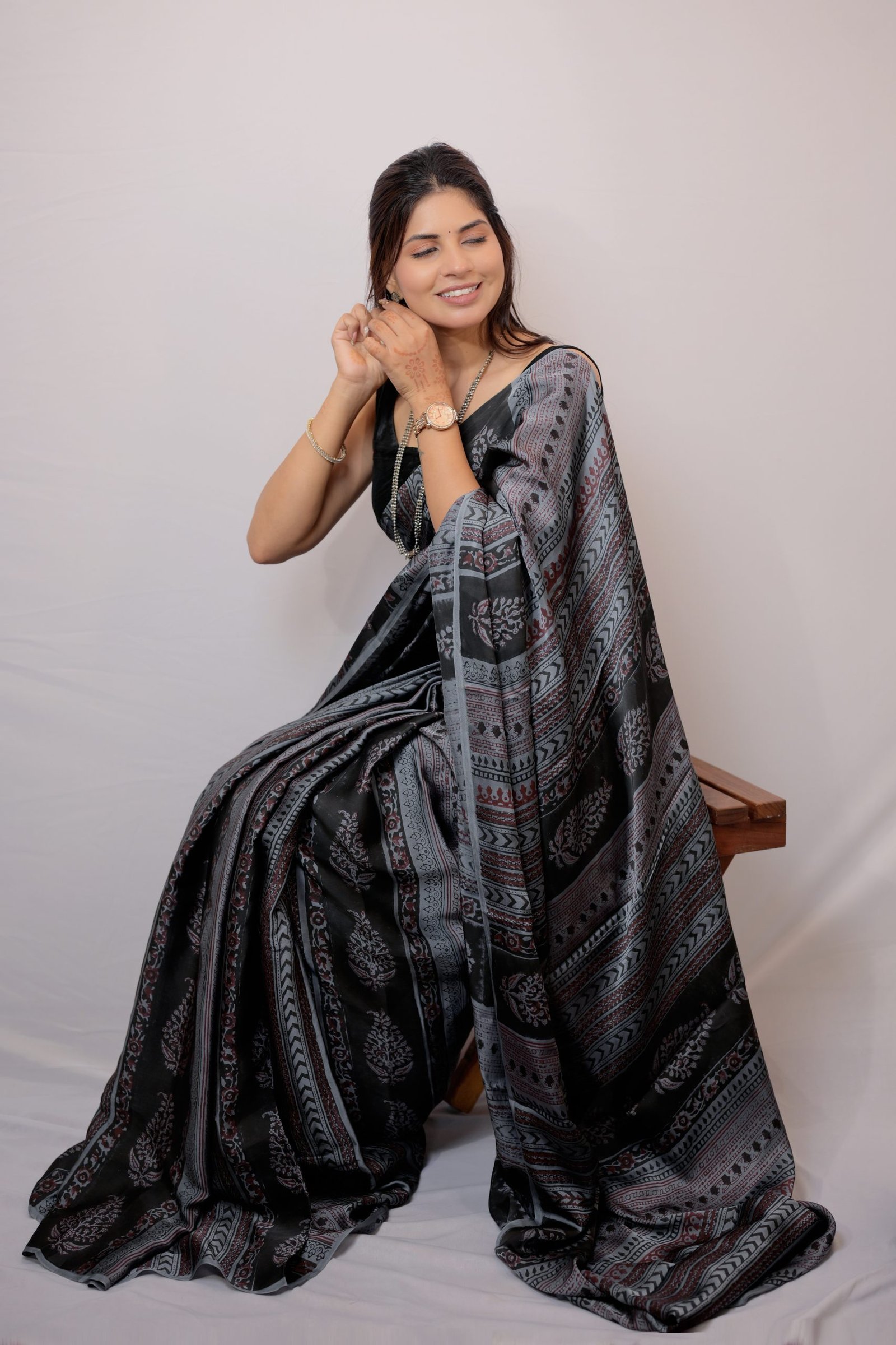 If you’re looking for a hand block printed modal silk saree, this Bhairongarh Modal Silk Saree combines luxury fabric with artisanal craft. This traditional yet contemporary design saree reflects creativity, tradition and modern elegance. The saree is perfect for office wear, gatherings, evening party, cocktail party, get togethers and formal occasions.