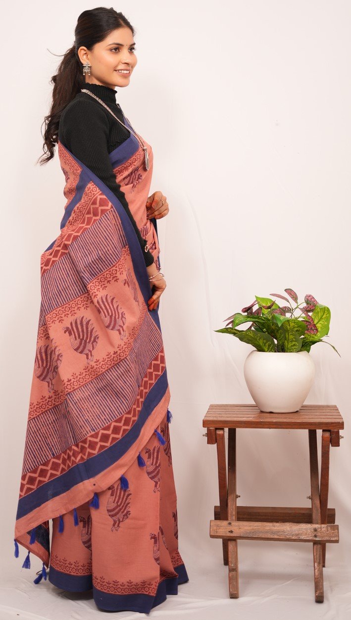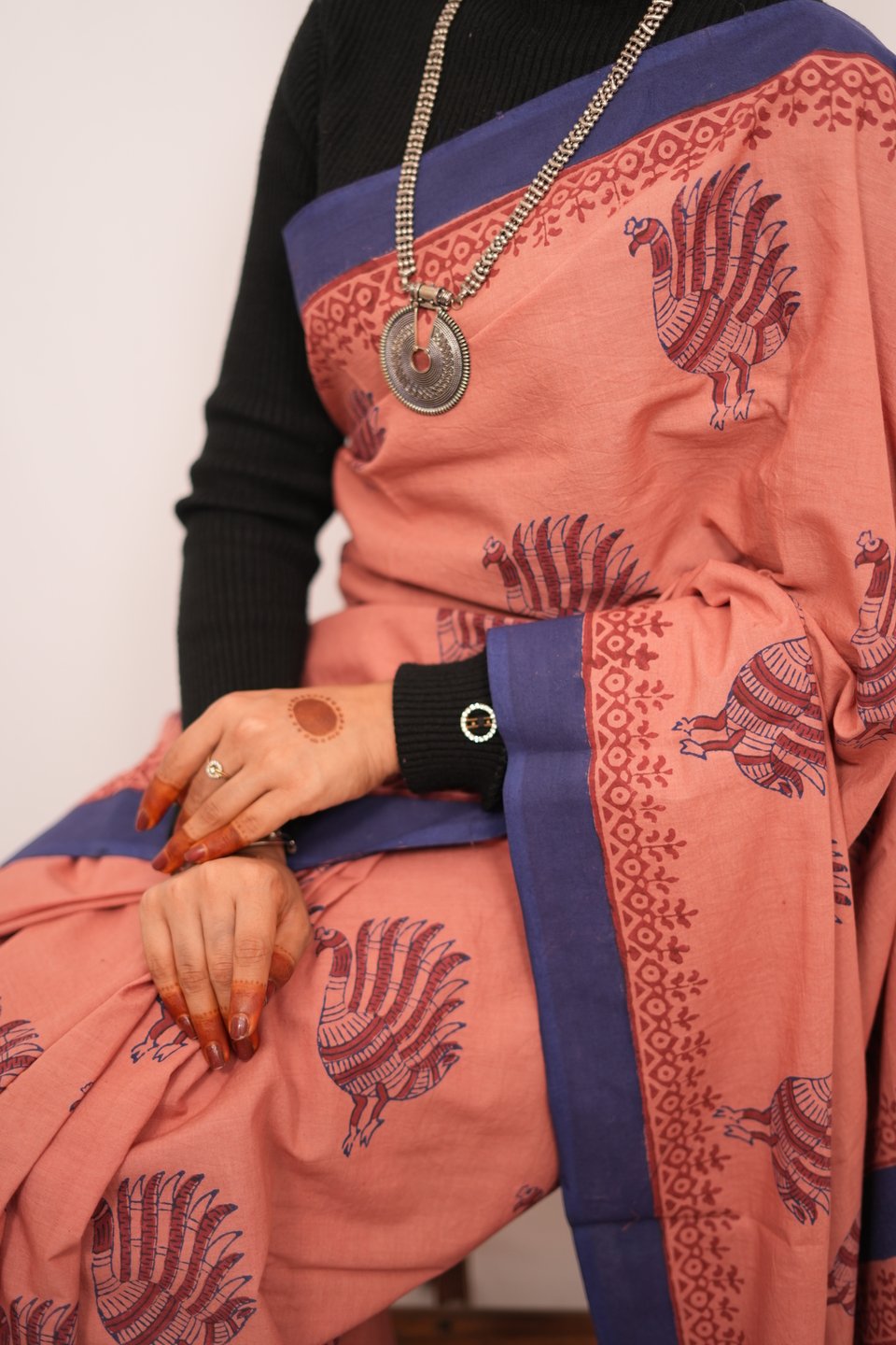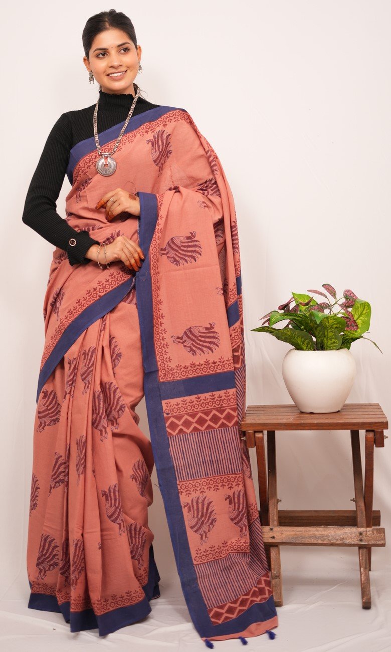 This is an exquisite Hand Block Printed Saree beautifully crafted by the skilled women artisans at Alankaran Designs.  Each design narrates a tale of meticulous craftsmanship by the talented women artisans of Alankaran Designs. Cotton Mulmul fabric will adorn you like breeze of cool air. It is very light weighted and easy to wear.