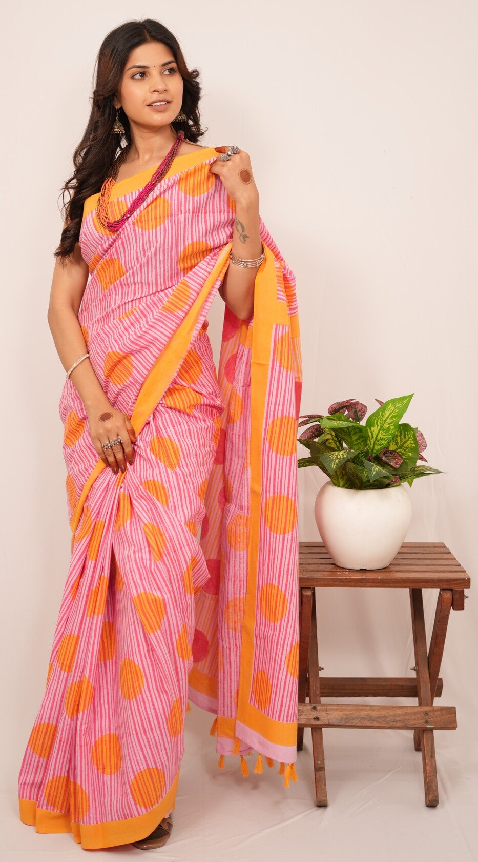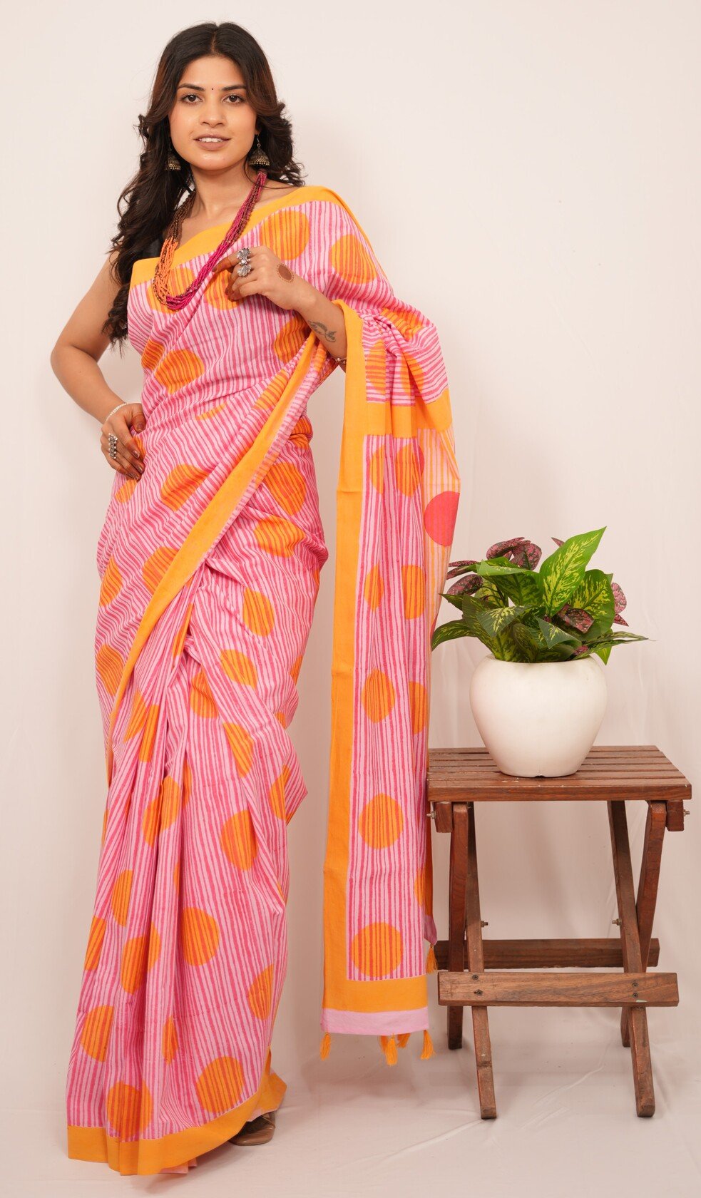 Each saree is a labor of love, featuring intricate designs created through the traditional handblock printing technique. Artisans carve detailed wooden blocks, which they dip in vibrant, eco-friendly dyes. They then skillfully press these blocks onto the finest quality fabric, resulting in captivating patterns that tell stories of cultural significance and craftsmanship.