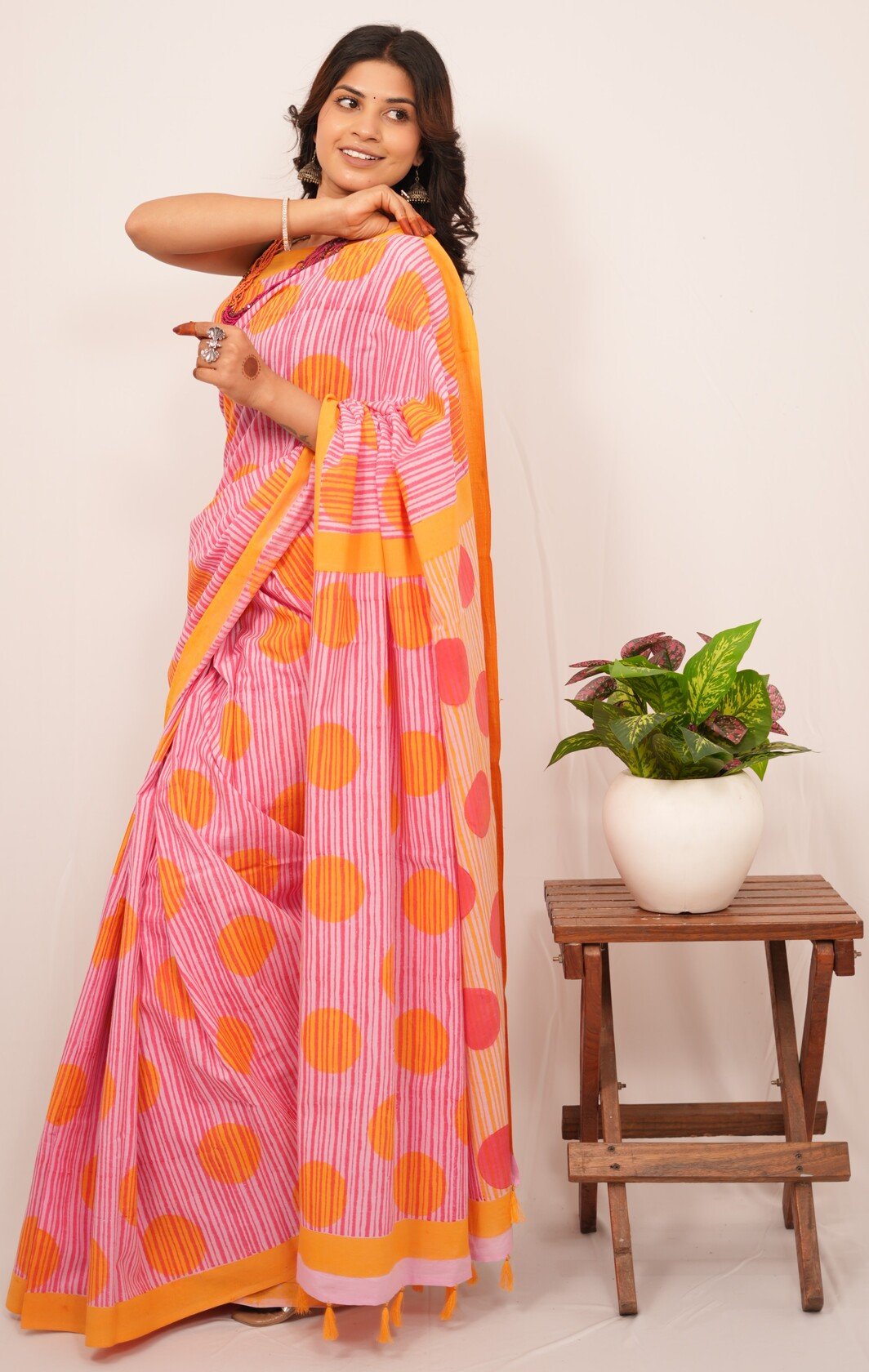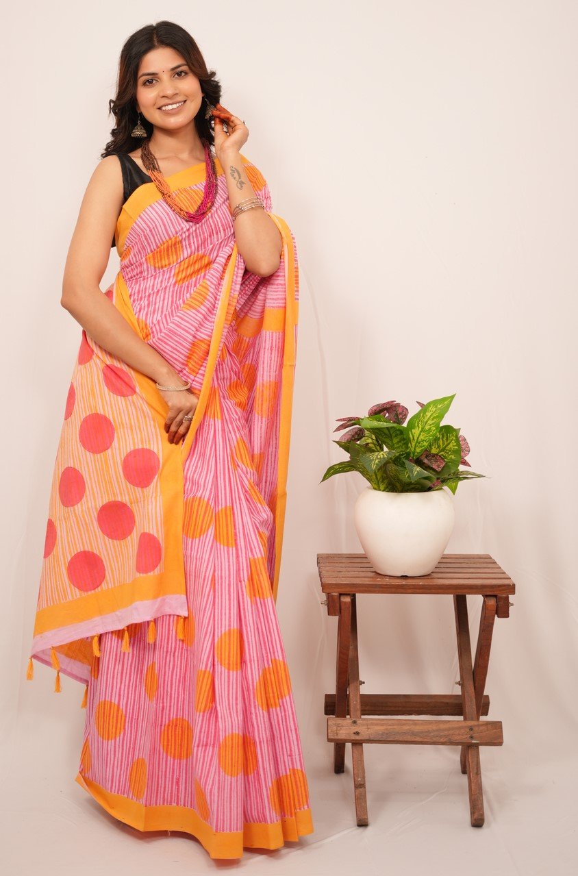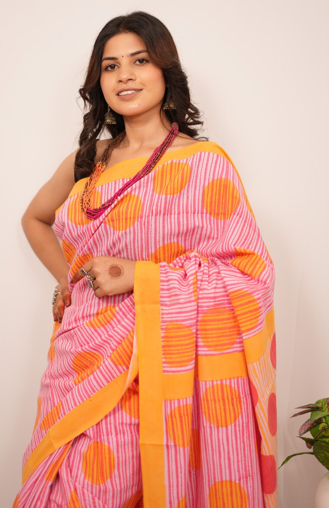 This is an exquisite Hand Block Printed Saree beautifully crafted by the skilled women artisans at Alankaran Designs.  Each design narrates a tale of meticulous craftsmanship by the talented women artisans of Alankaran Designs. Cotton Mulmul fabric will adorn you like breeze of cool air. It is very light weighted and easy to wear.