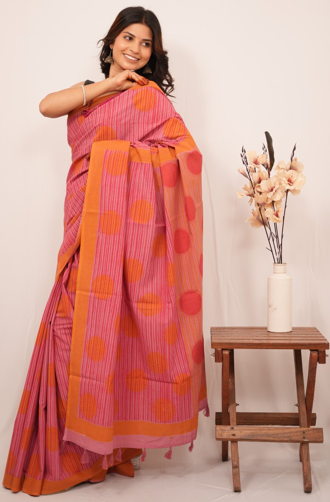 Each saree is a labor of love, featuring intricate designs created through the traditional handblock printing technique. Artisans carve detailed wooden blocks, which they dip in vibrant, eco-friendly dyes. They then skillfully press these blocks onto the finest quality fabric, resulting in captivating patterns that tell stories of cultural significance and craftsmanship.