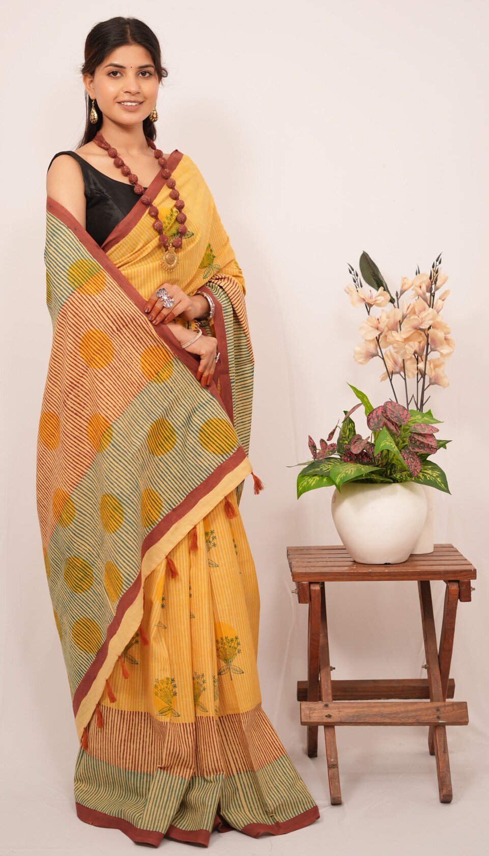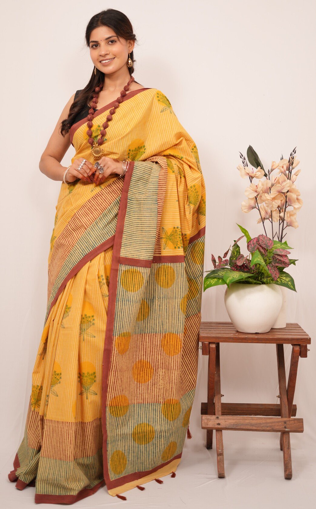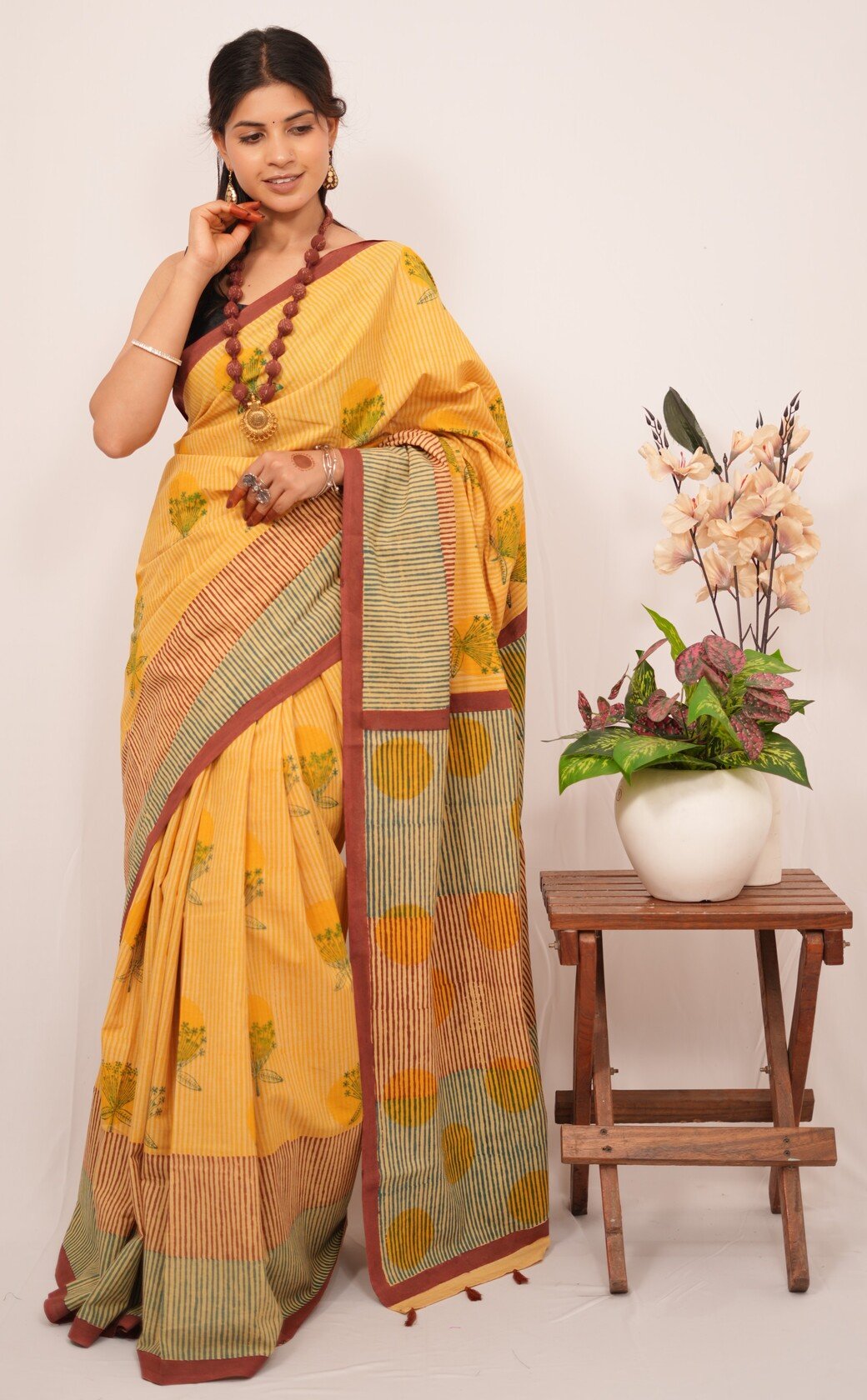 Each saree is a labor of love, featuring intricate designs created through the traditional handblock printing technique. Artisans carve detailed wooden blocks, which they dip in vibrant, eco-friendly dyes. They then skillfully press these blocks onto the finest quality fabric, resulting in captivating patterns that tell stories of cultural significance and craftsmanship.