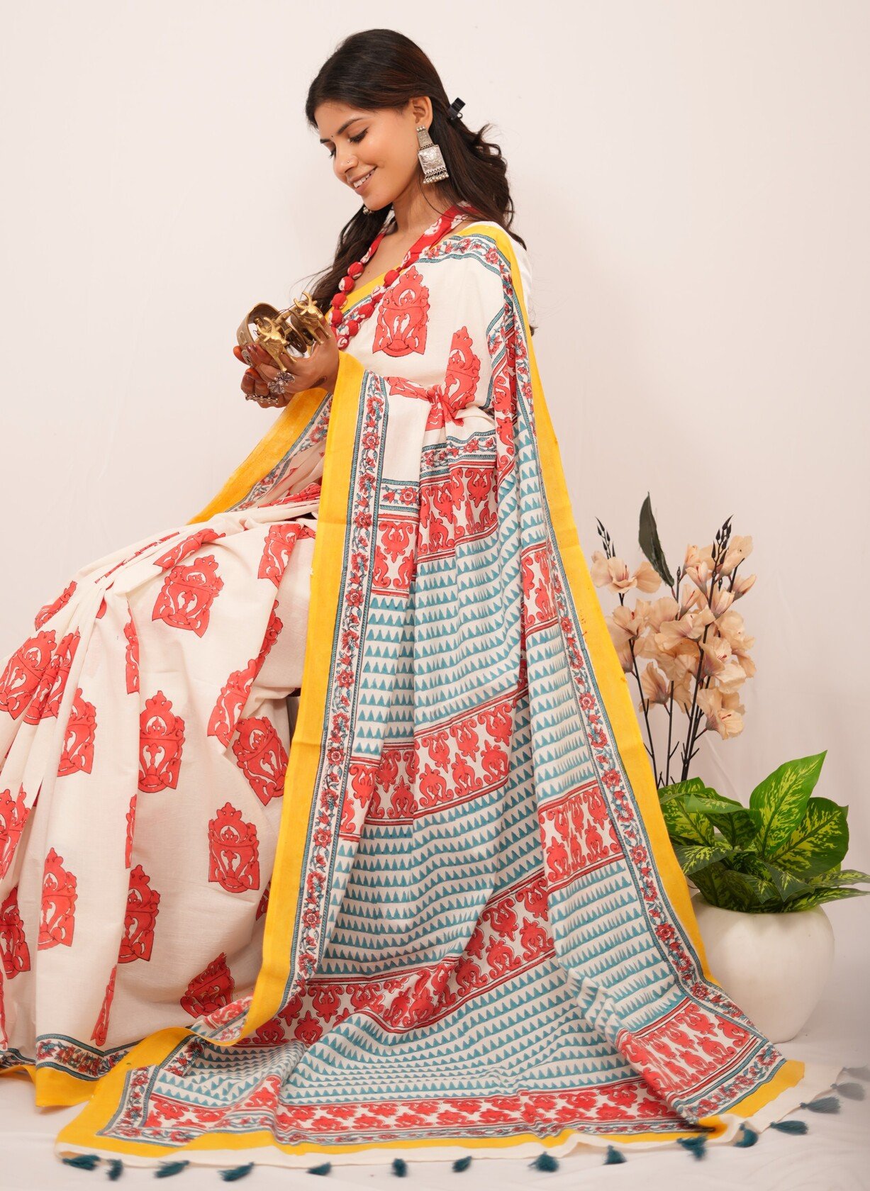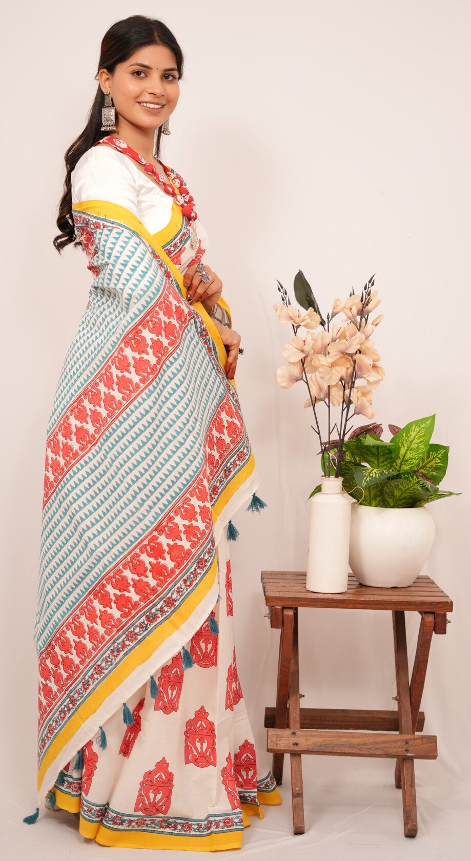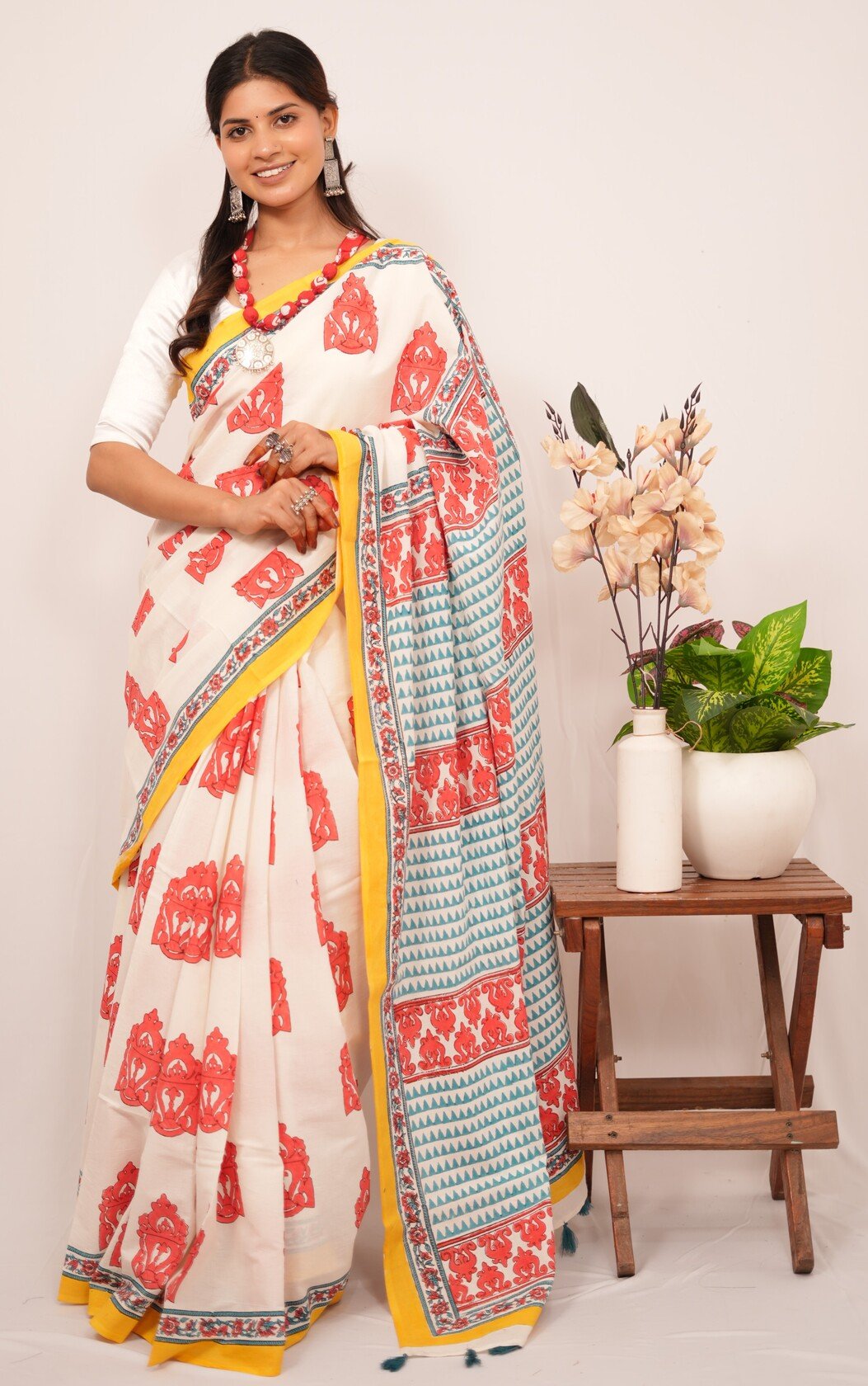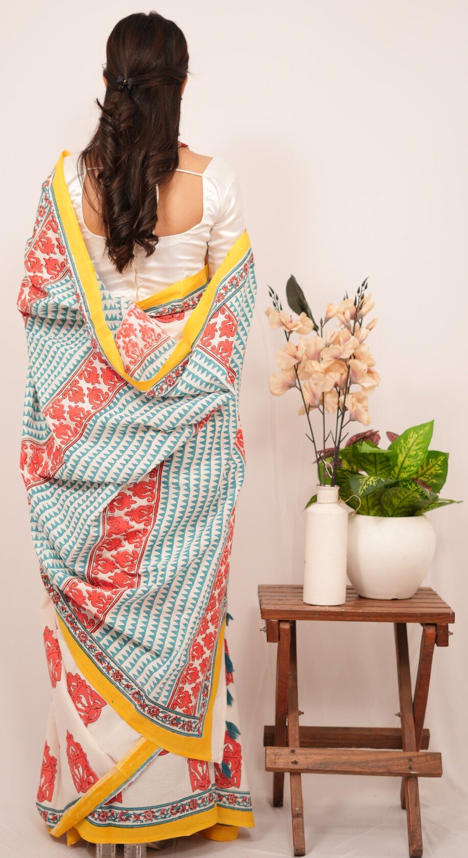 Each saree is a labor of love, featuring intricate designs created through the traditional handblock printing technique. Artisans carve detailed wooden blocks, which they dip in vibrant, eco-friendly dyes. They then skillfully press these blocks onto the finest quality fabric, resulting in captivating patterns that tell stories of cultural significance and craftsmanship.