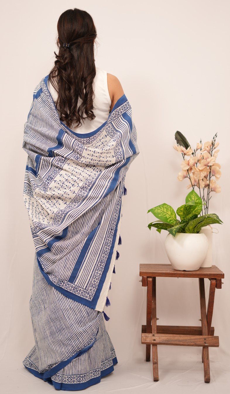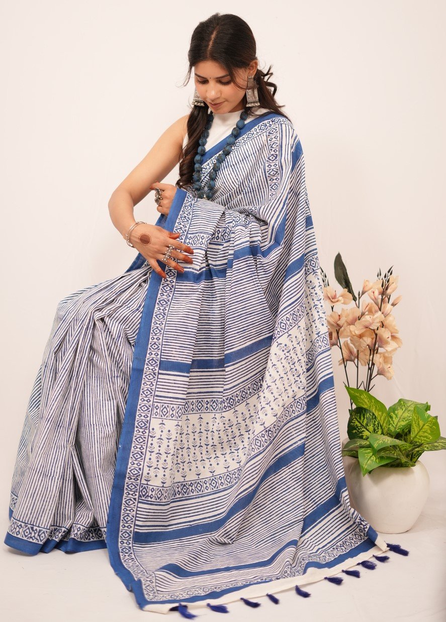 Each saree is a labor of love, featuring intricate designs created through the traditional handblock printing technique. Artisans carve detailed wooden blocks, which they dip in vibrant, eco-friendly dyes. They then skillfully press these blocks onto the finest quality fabric, resulting in captivating patterns that tell stories of cultural significance and craftsmanship.