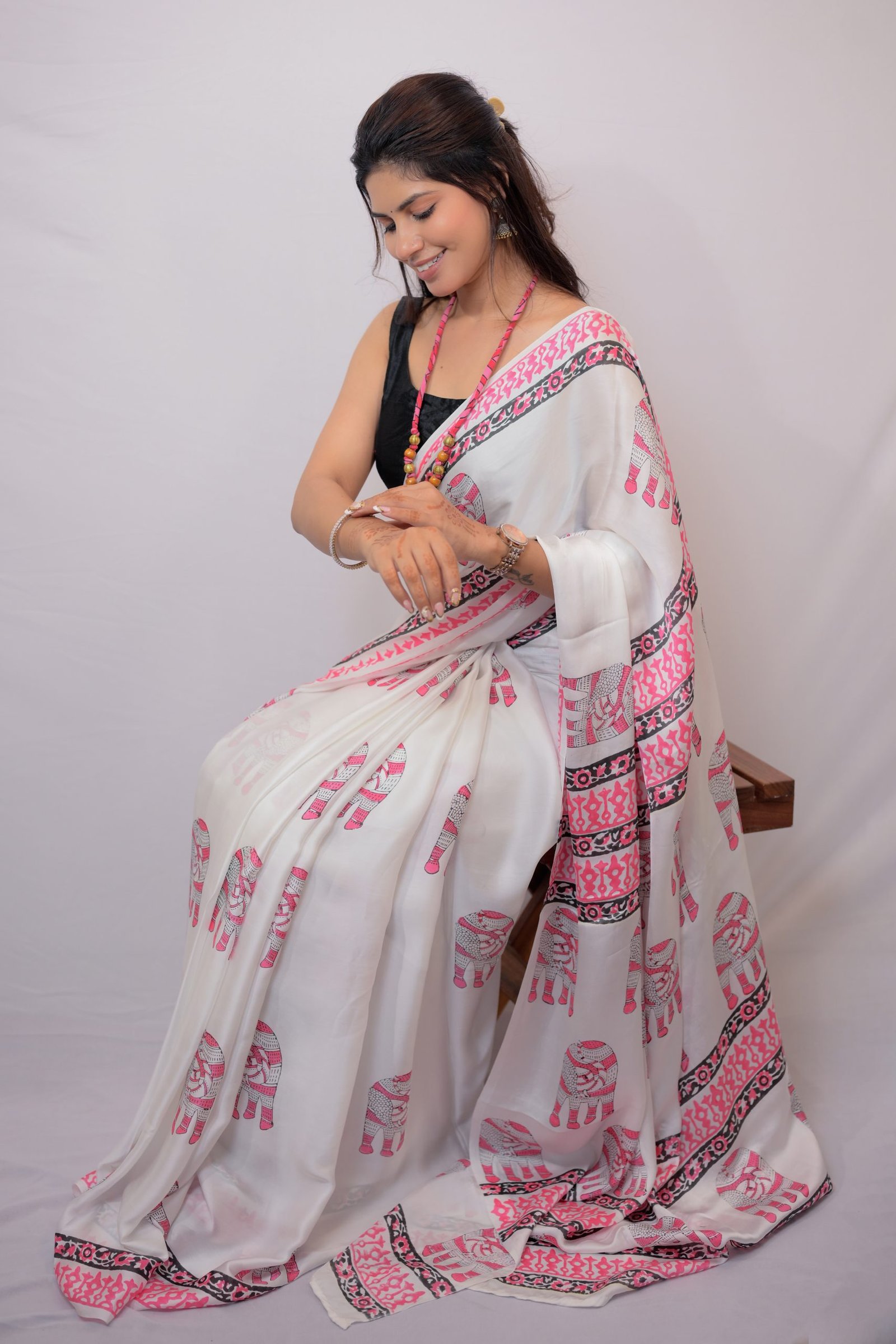 Experience the elegance of traditional craftsmanship with the Gajdevi Modal Silk Saree, crafted in luxurious modal silk and adorned with hand block printed beautiful Gond painting inspired Elephant motifs.  Each block is carefully printed by skilled artisans, making every saree unique and timeless.