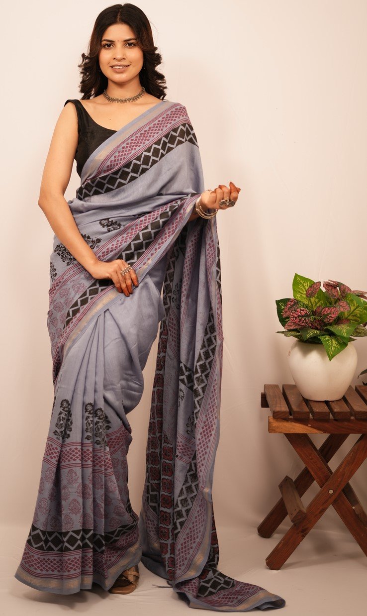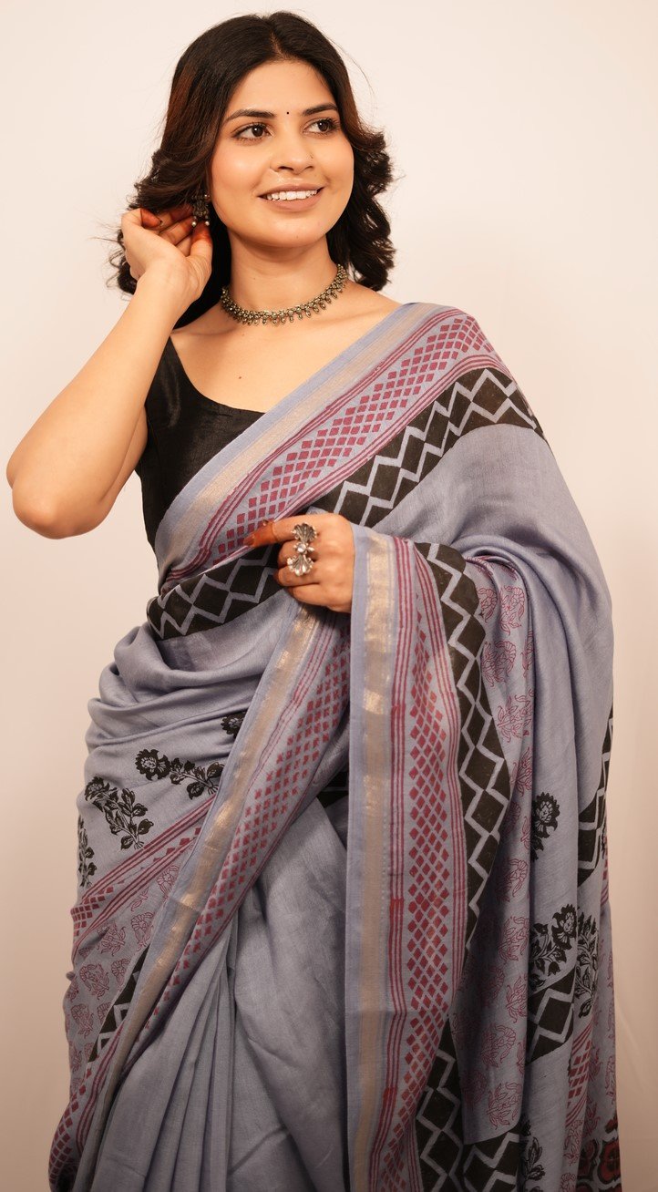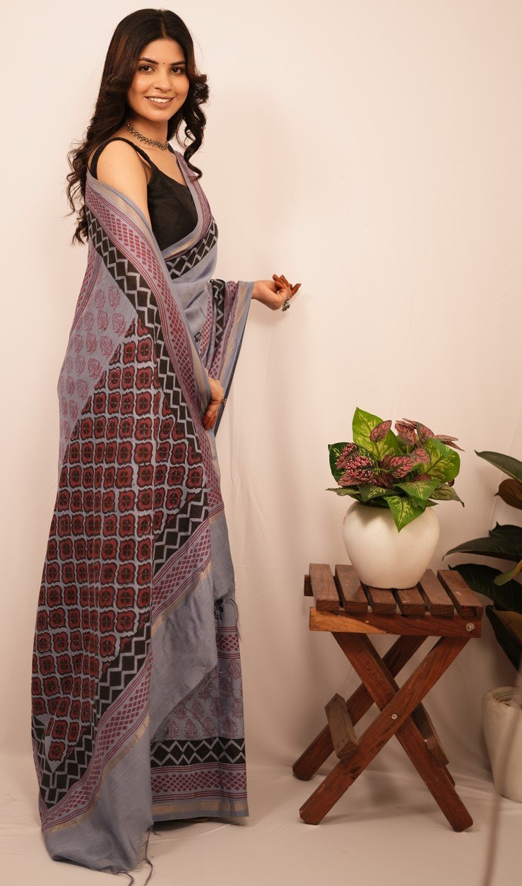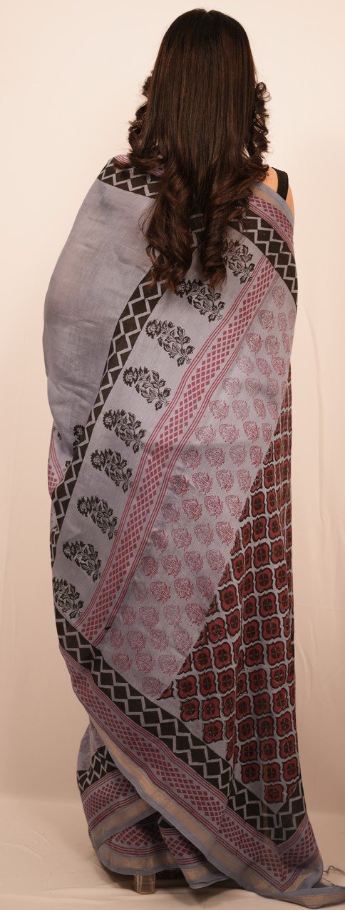 In design and craftsmanship, each saree is a labor of love, with artisans hand-carving intricate wooden blocks representing unique design elements. These blocks are dipped in rich, vibrant dyes and skillfully pressed onto the finest quality fabric, creating captivating patterns narrating stories of culture and tradition.
