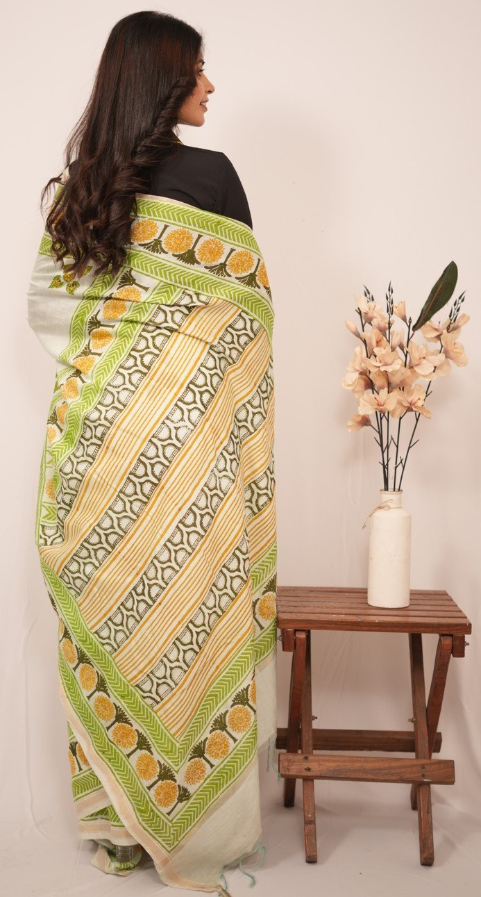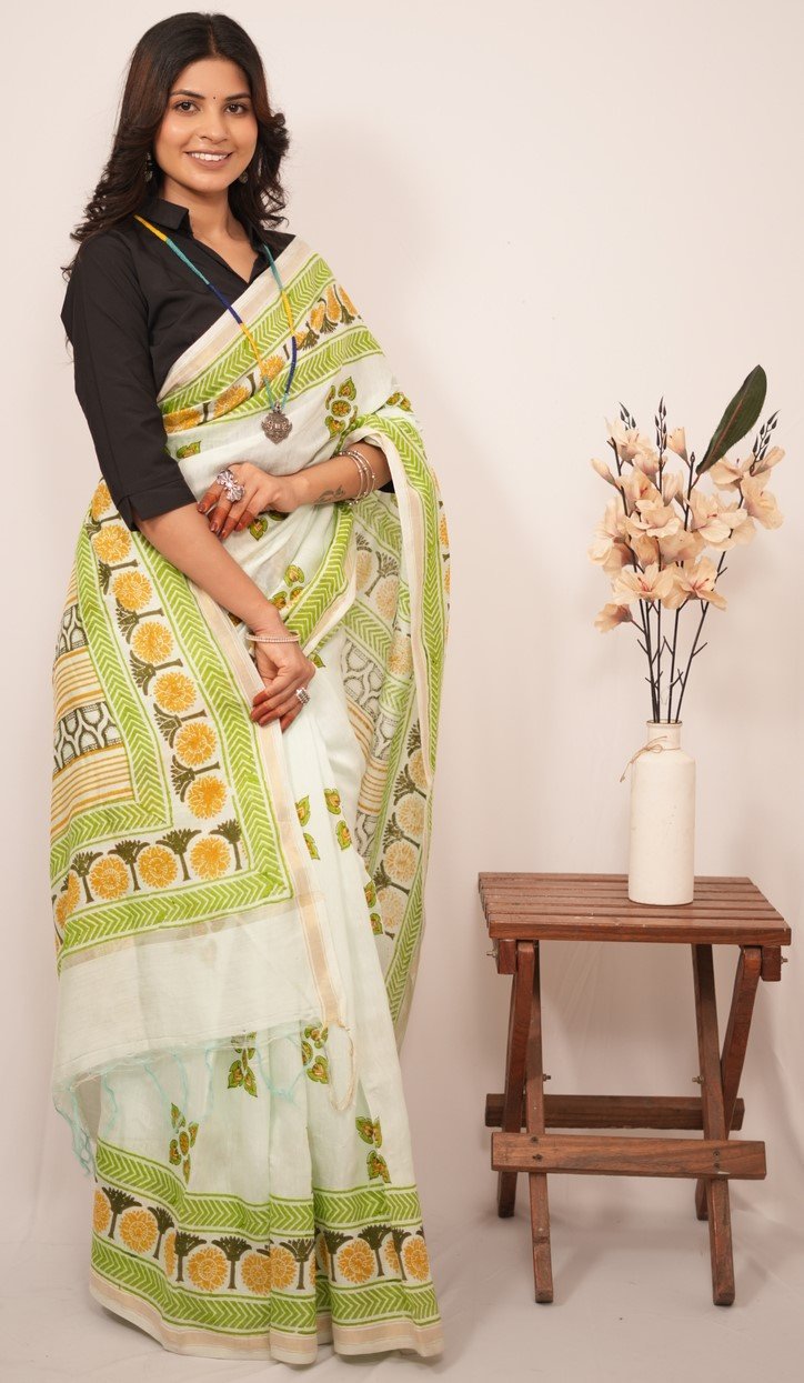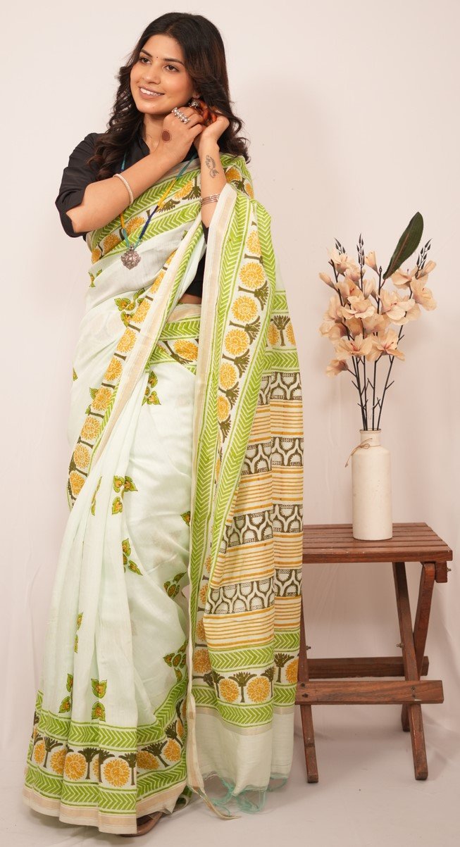 In design and craftsmanship, each saree is a labor of love, with artisans hand-carving intricate wooden blocks representing unique design elements. These blocks are dipped in rich, vibrant dyes and skillfully pressed onto the finest quality fabric, creating captivating patterns narrating stories of culture and tradition.