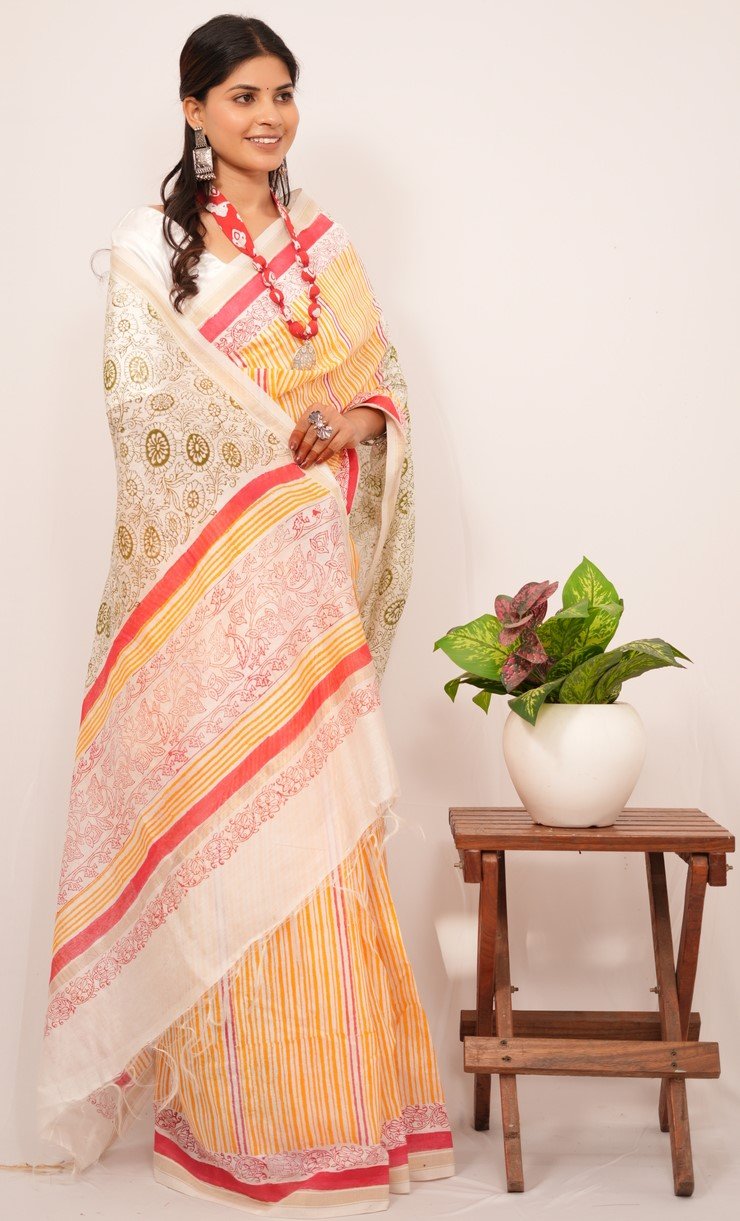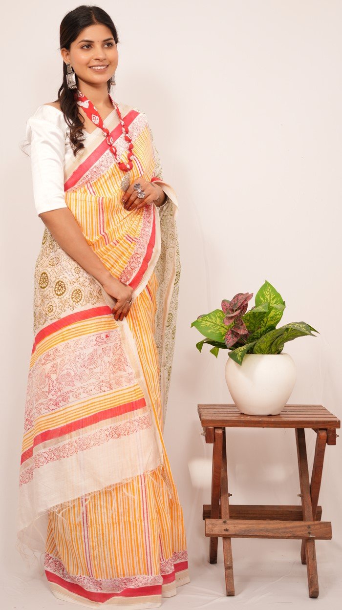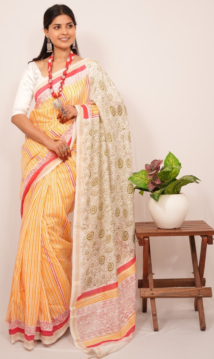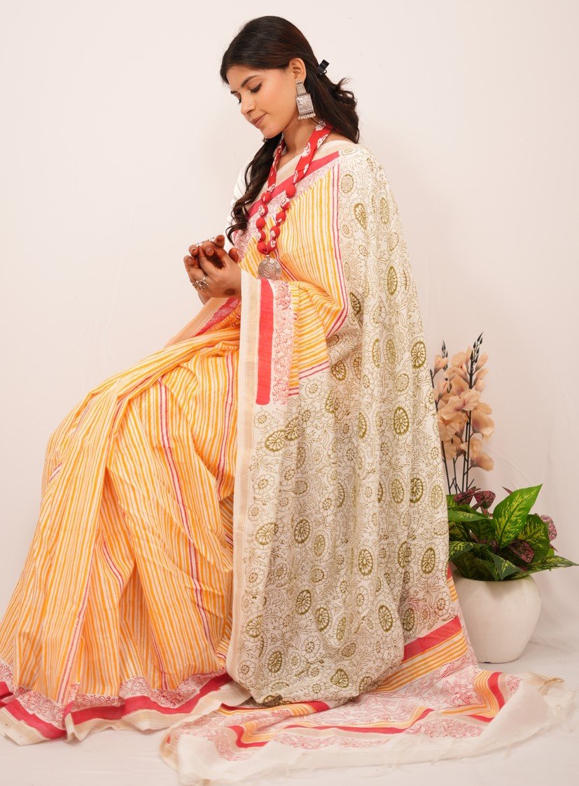 In design and craftsmanship, each saree is a labor of love, with artisans hand-carving intricate wooden blocks representing unique design elements. These blocks are dipped in rich, vibrant dyes and skillfully pressed onto the finest quality fabric, creating captivating patterns narrating stories of culture and tradition.