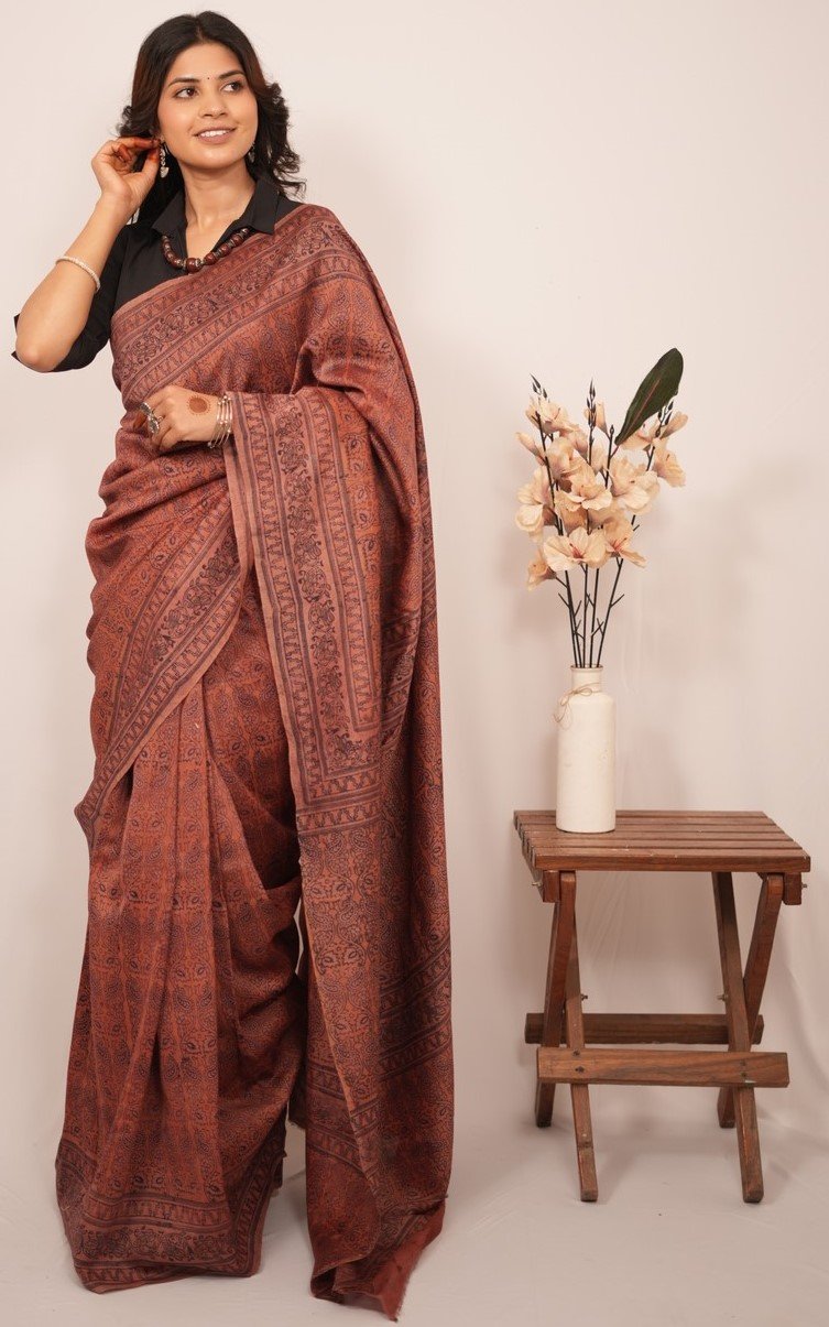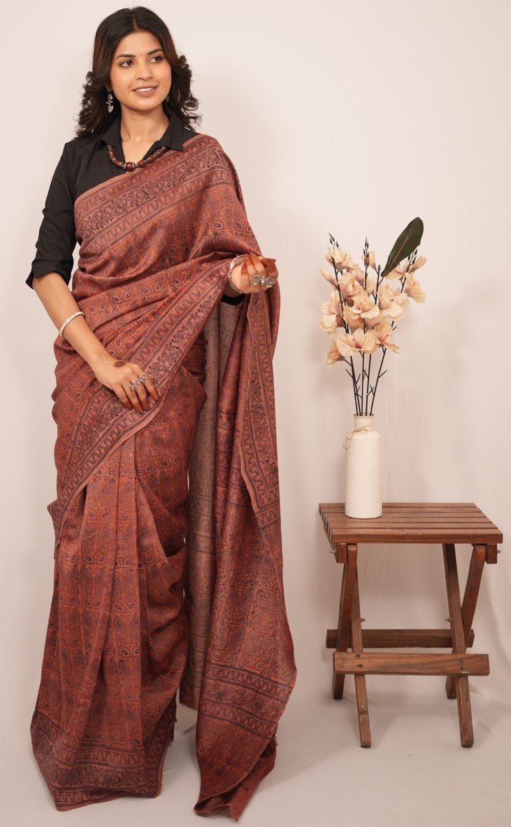 In design and craftsmanship, each saree is a labor of love, with artisans hand-carving intricate wooden blocks representing unique design elements. These blocks are dipped in rich, vibrant dyes and skillfully pressed onto the finest quality fabric, creating captivating patterns narrating stories of culture and tradition.