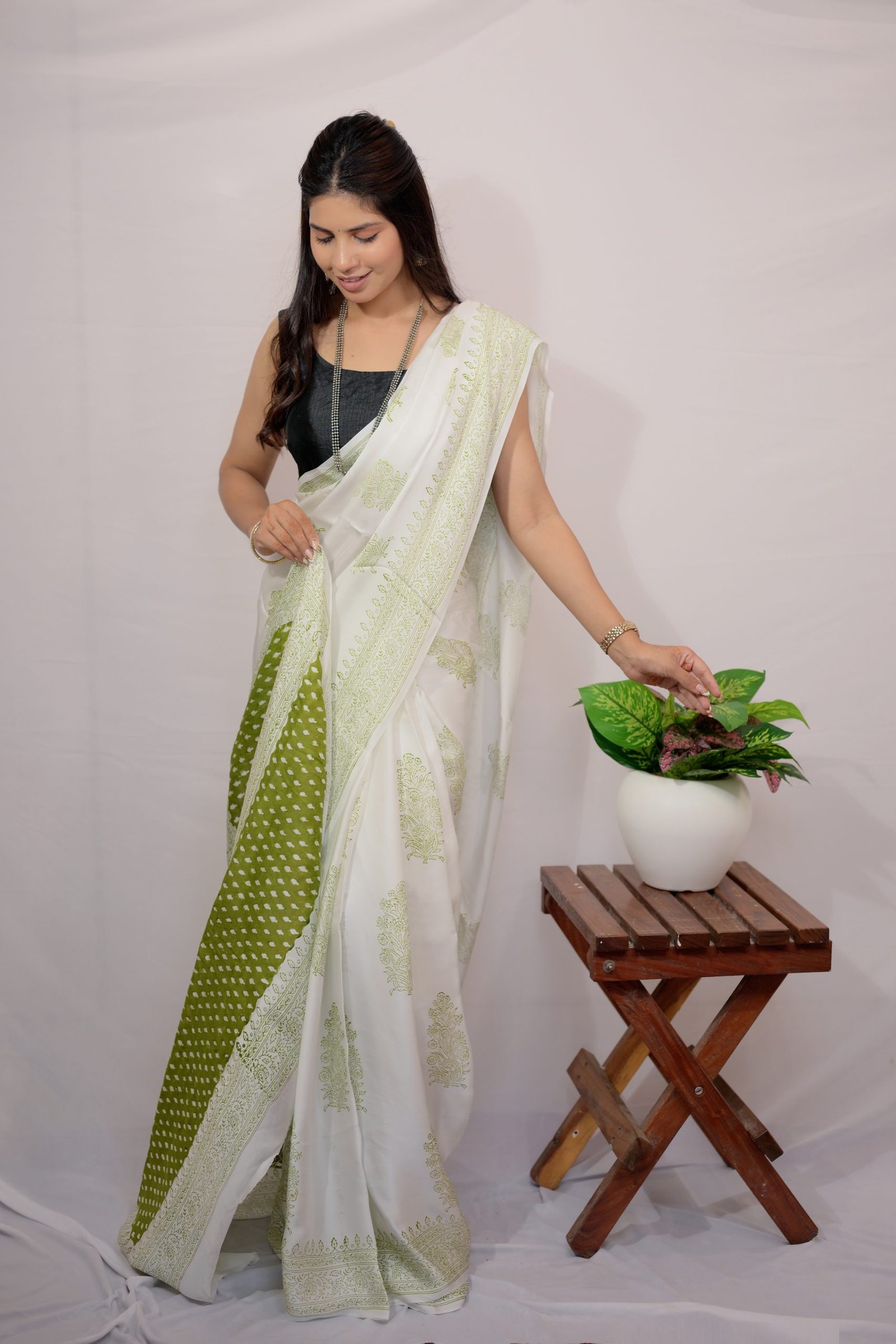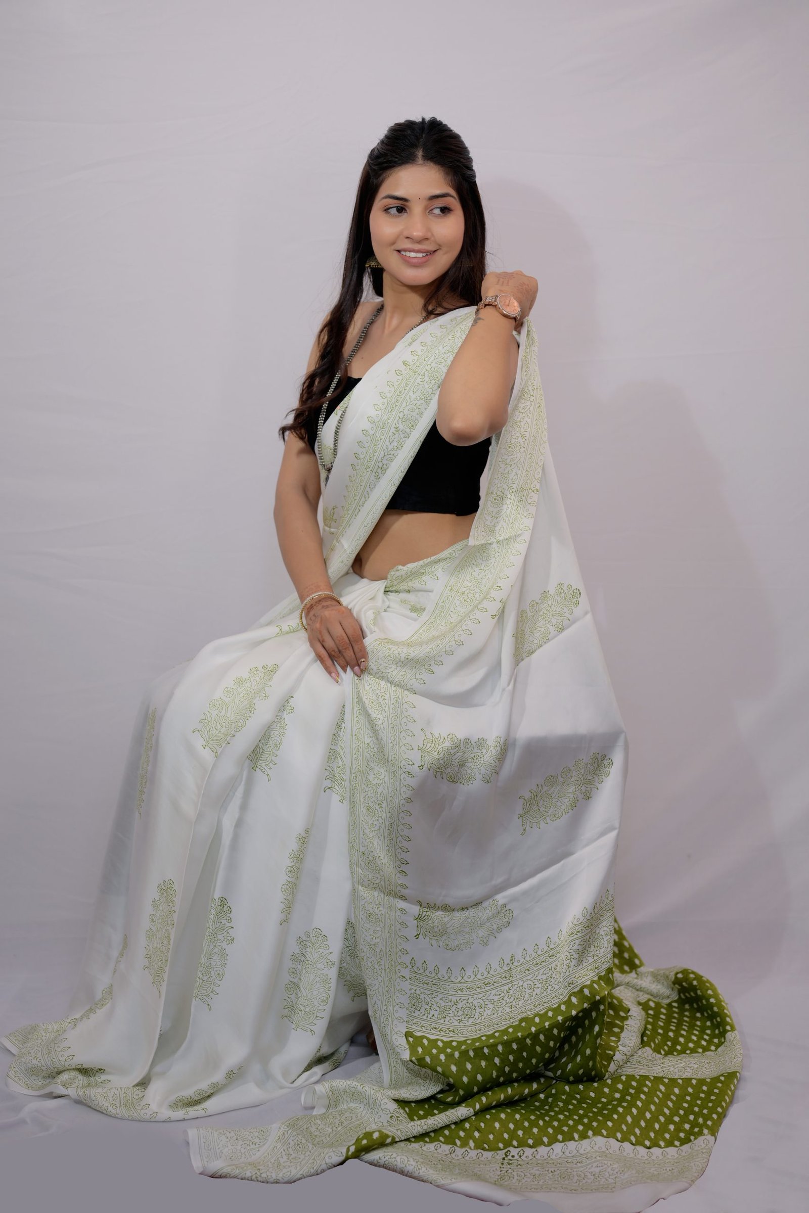 Experience the elegance of traditional craftsmanship with the Haritima print Modal Silk Saree, crafted in luxurious modal silk and adorned with hand block printed beautiful green boota with jawar dana motif of Bhairongarh cluster of Madhya Pradesh. This saree is a revival effort for identity o traditional designs of Madhya Pradesh. Each block is carefully printed by skilled artisans, making every saree unique and timeless.