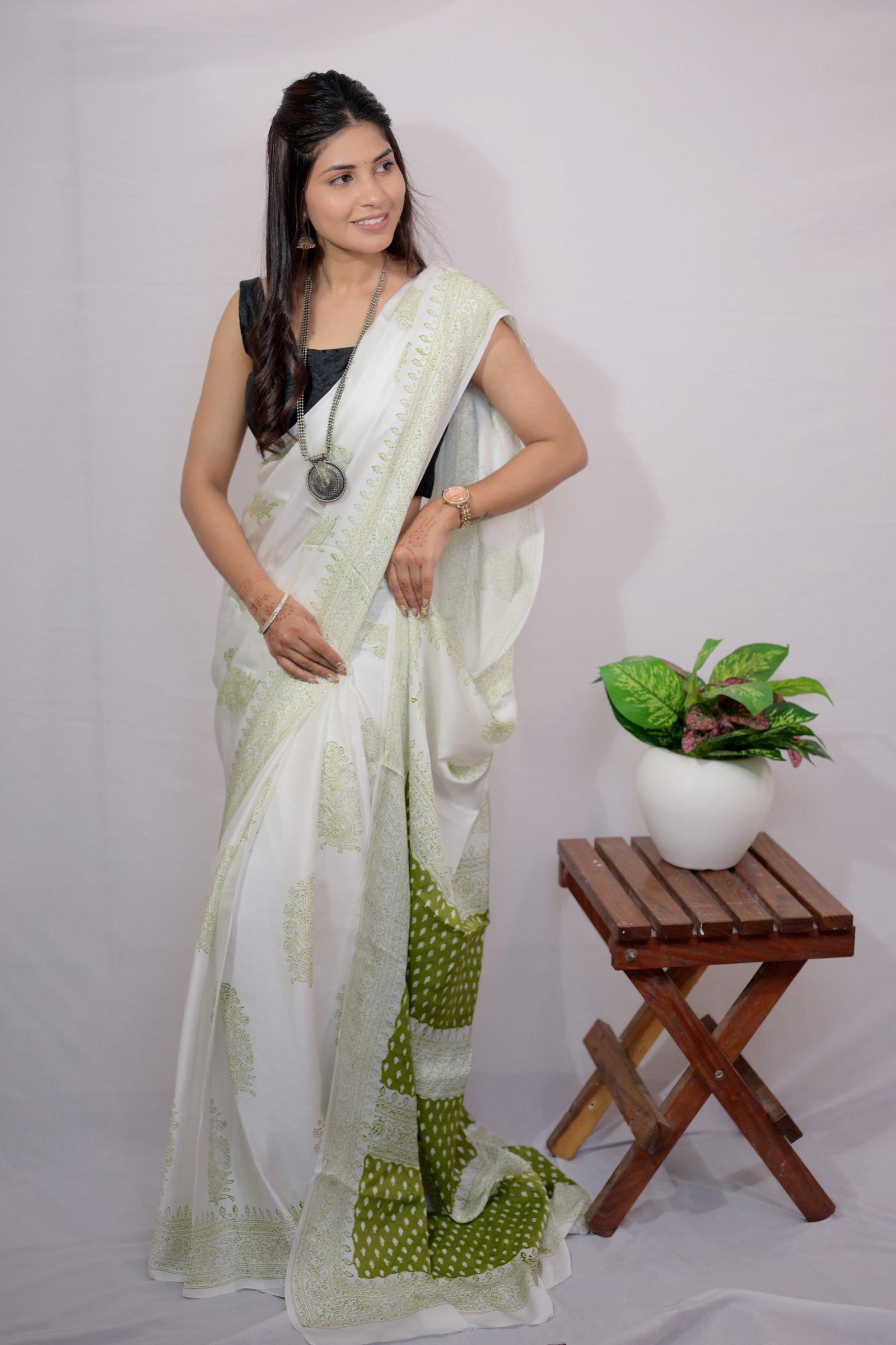 The Haritima print Modal Silk Saree has white base and is beautifully complemented with green prints, giving the saree a beautiful grace. The vertical borders give an elegant pose to the saree. Designed in standard size with a matching blouse piece, it drapes gracefully and is ideal for festive occasions, weddings, office parties, or cultural gatherings.