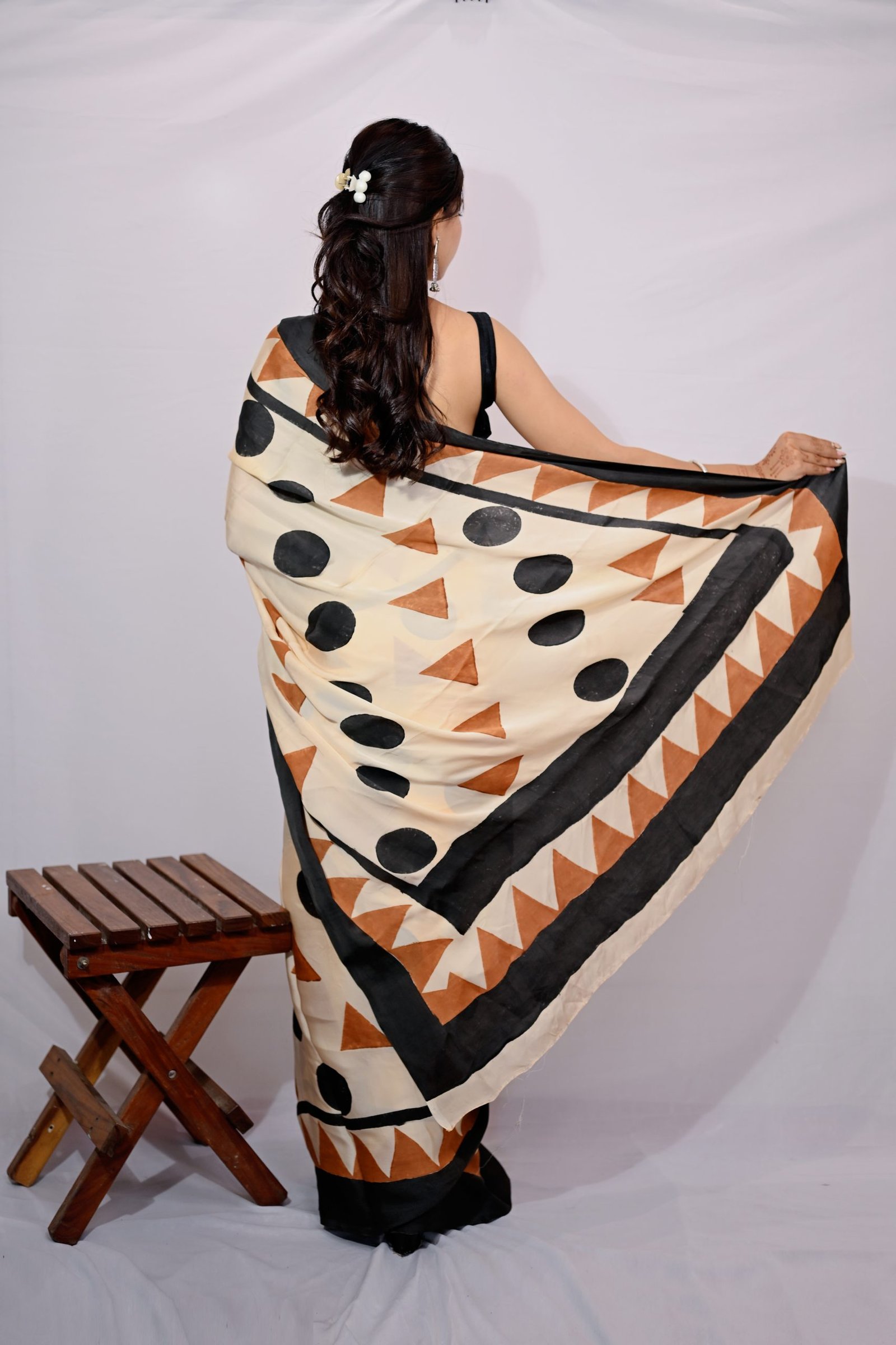 Experience the elegance of traditional craftsmanship with the Jyamiti Modal Silk Saree. It is crafted in luxurious modal silk and adorned with hand block printed geometric motifs inspired by Jyamiti (geometry). Each motif is carefully printed by skilled artisans, making every saree unique and timeless.