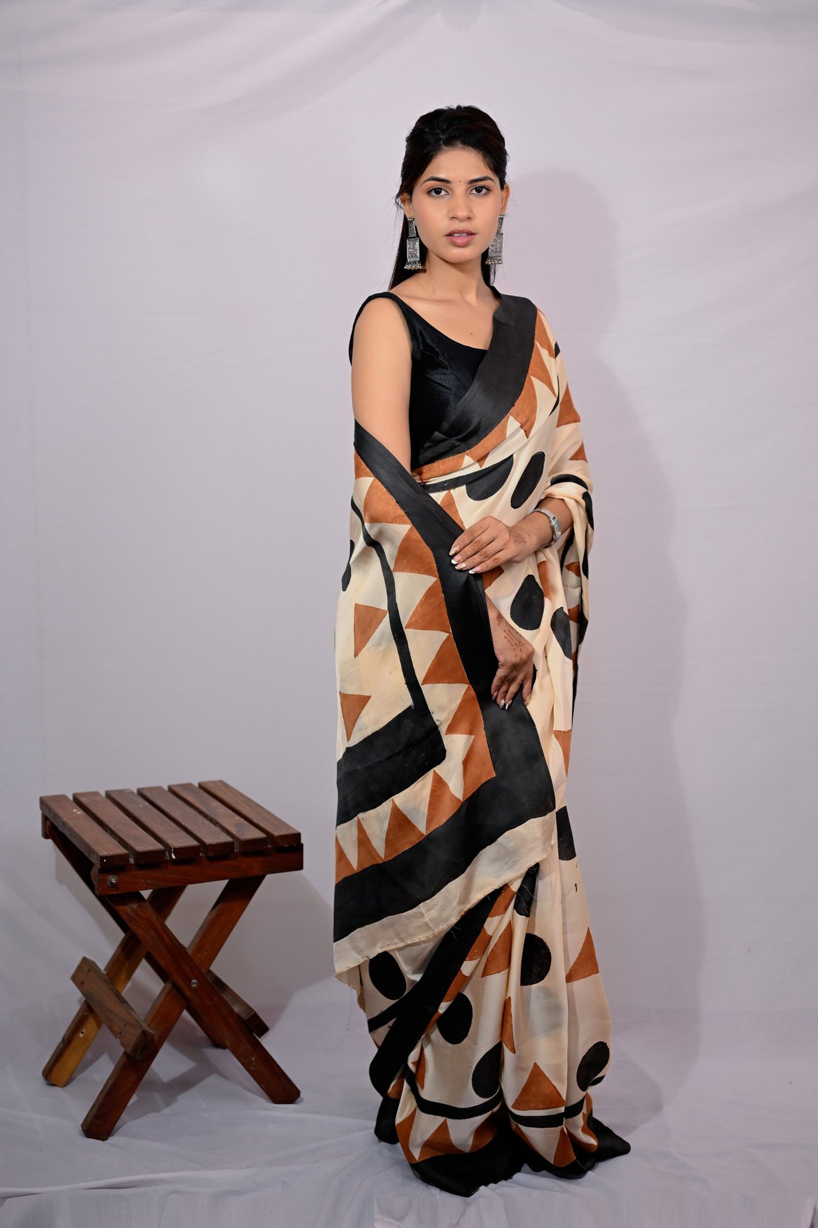 Experience the elegance of traditional craftsmanship with the Jyamiti Print Modal Silk Saree, crafted in luxurious modal silk and adorned with hand block printed geometric motifs inspired by Jyamiti (geometry). Each motif is carefully printed by skilled artisans, making every saree unique and timeless.
