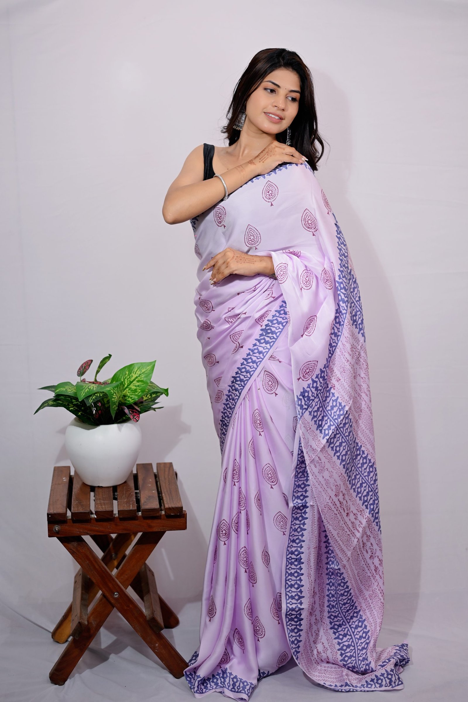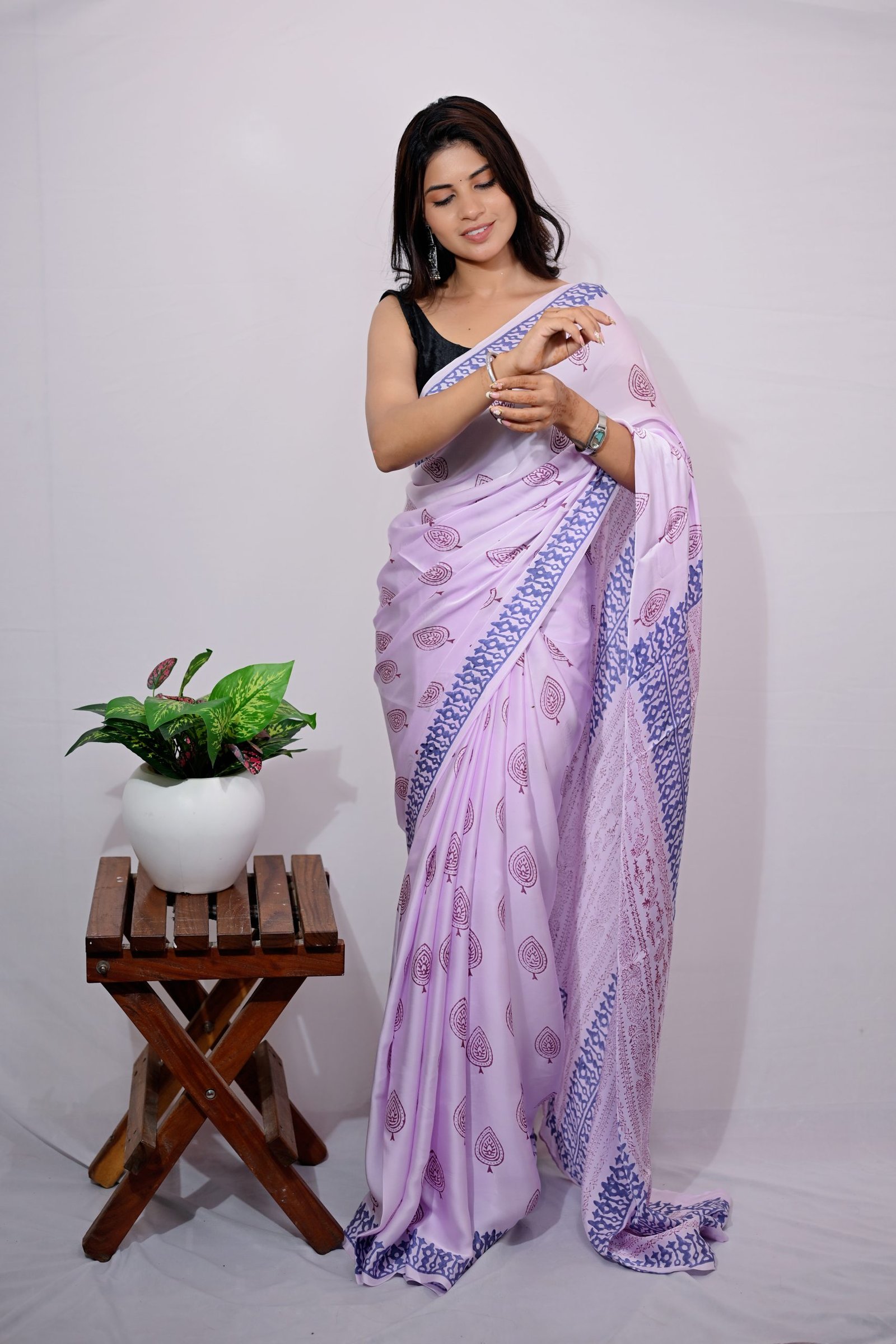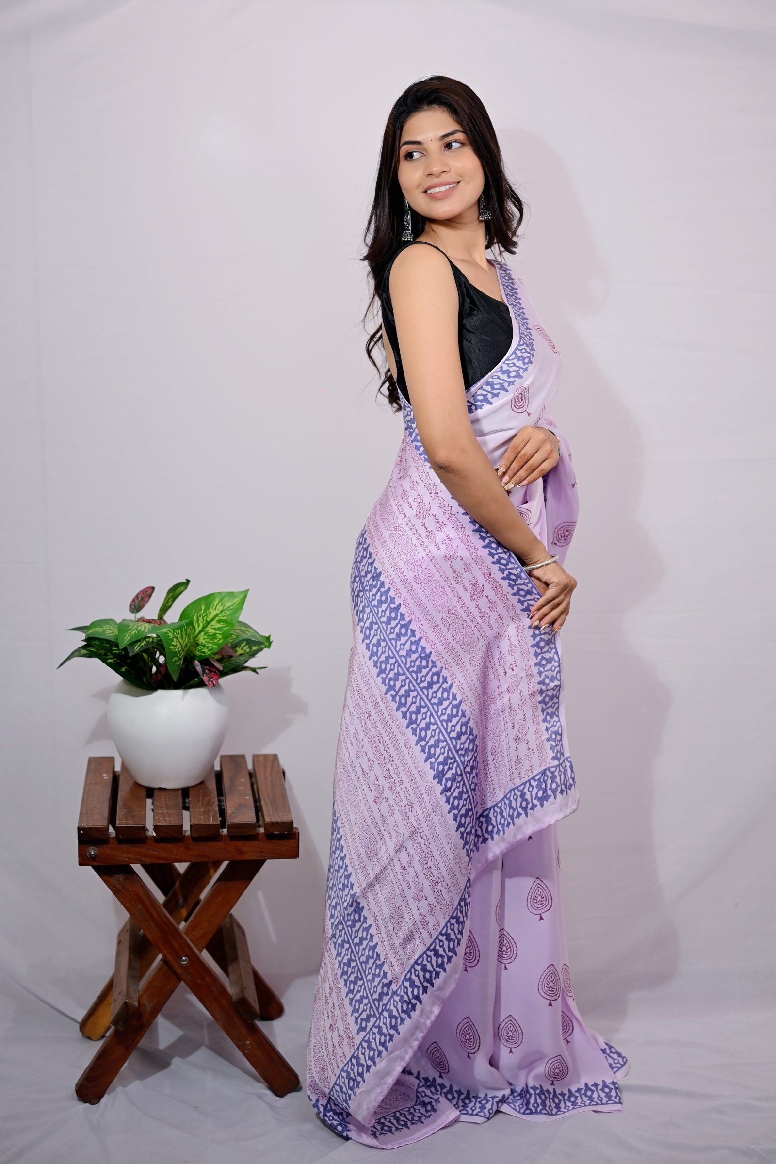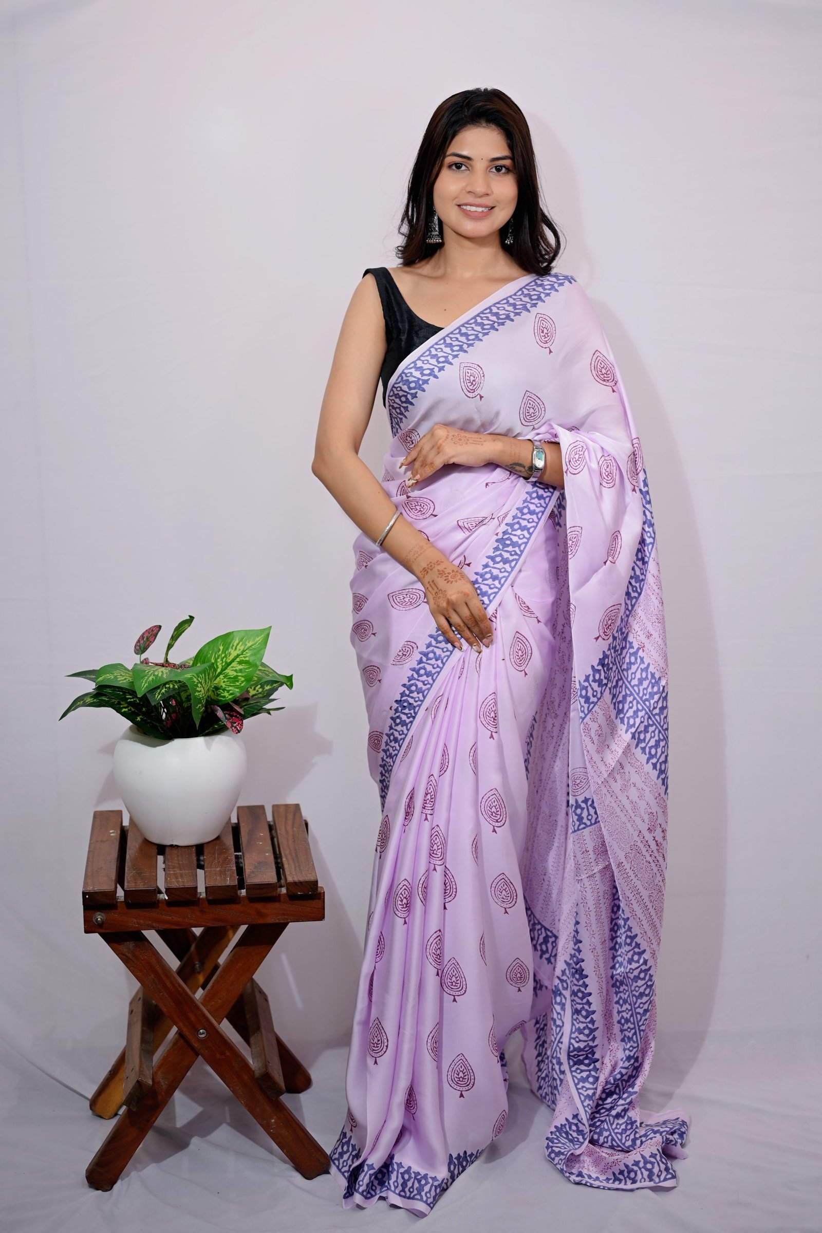 Experience the elegance of traditional craftsmanship with the Lavender Modal silk saree MD 17, crafted in luxurious modal silk and adorned with hand block printed beautiful  leaf motif .  Each block is carefully printed by skilled artisans, making every saree unique and timeless.