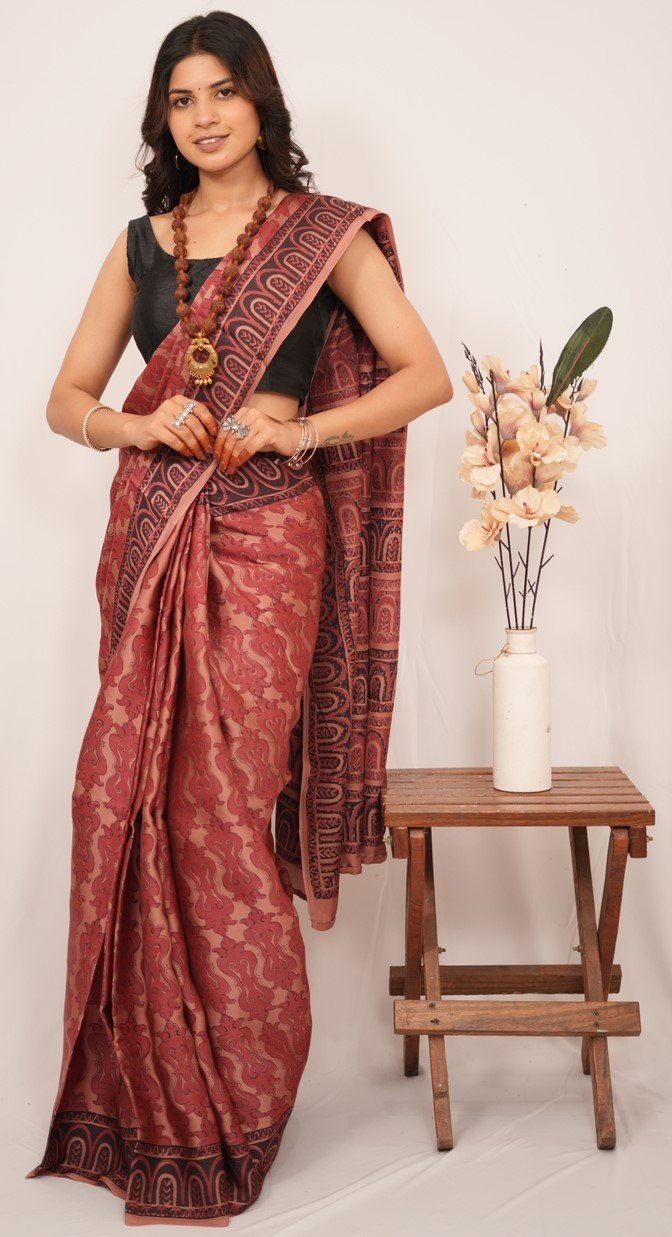The Smriti Modal Silk Saree has peach nude base and is beautifully complemented with Light Brown and Maroon, giving the saree a beautiful and Devine elegance. Designed in standard size with a matching blouse piece, it drapes gracefully and is ideal for festive occasions, weddings, office parties, or cultural gatherings.