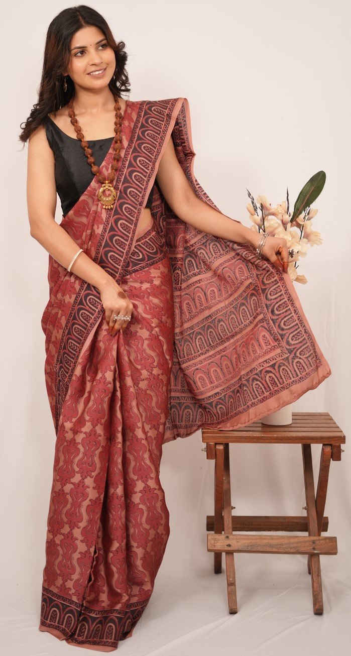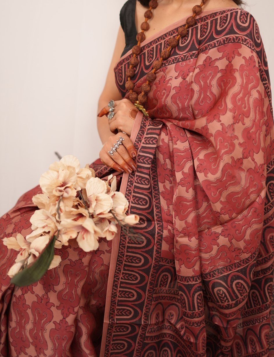 If you’re looking for a hand block printed modal silk saree, this Modal Silk Saree combines luxury fabric with artisanal craft. It’s not just a saree, but a piece of art that reflects design, creativity and modern elegance. It has a beautiful inspiration of Madhya Pradesh. to give you a niche appearance. The saree is perfect for office wear, gatherings, evening party, cocktail party, get togethers and formal occasions.