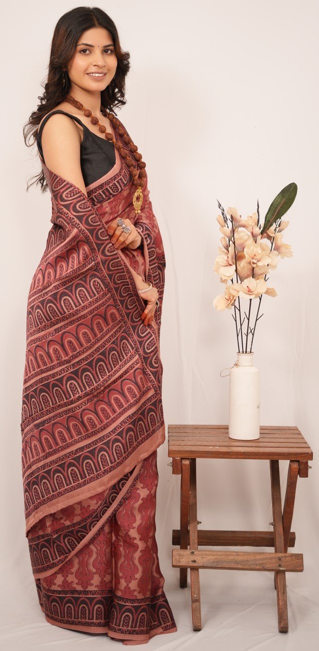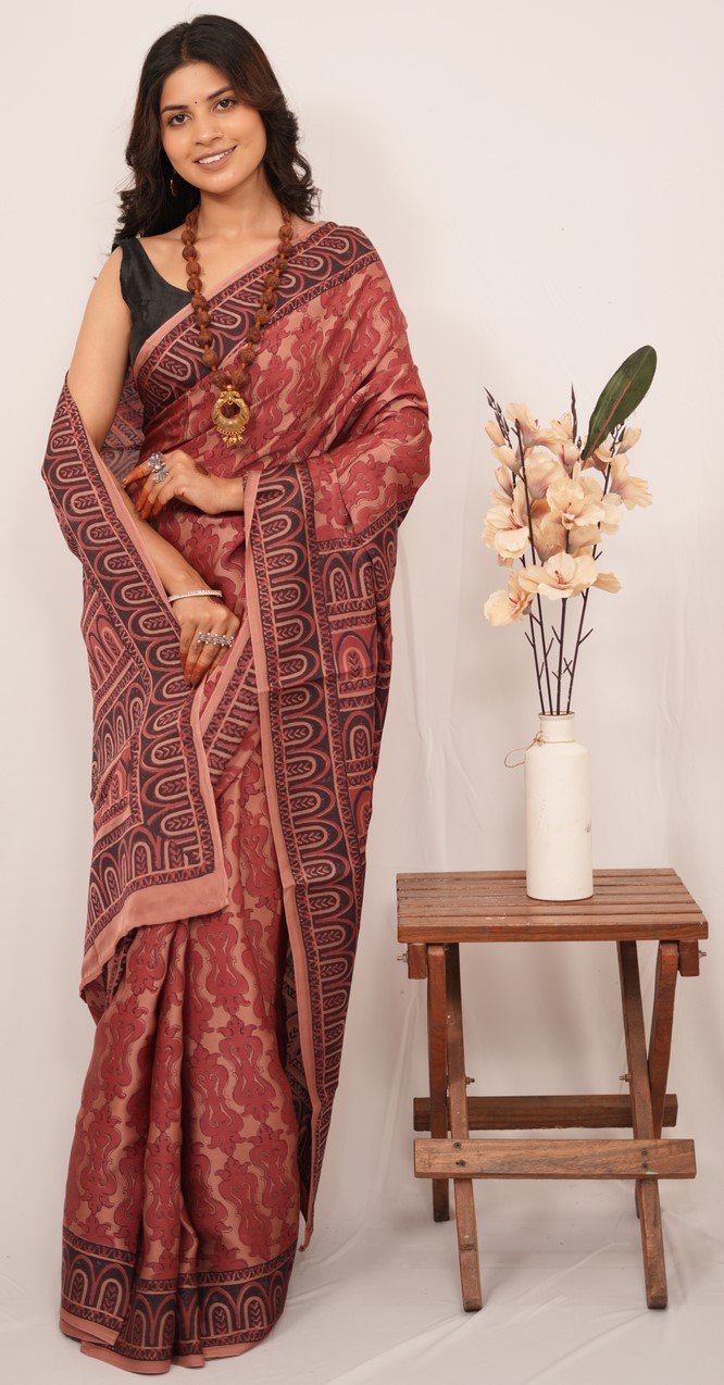 The Modal Silk Saree has peach nude base and is beautifully complemented with Light Brown and Maroon prints, giving the saree a beautiful and Devine elegance. Designed in standard size with a matching blouse piece, it drapes gracefully and is ideal for festive occasions, weddings, office parties, or cultural gatherings.