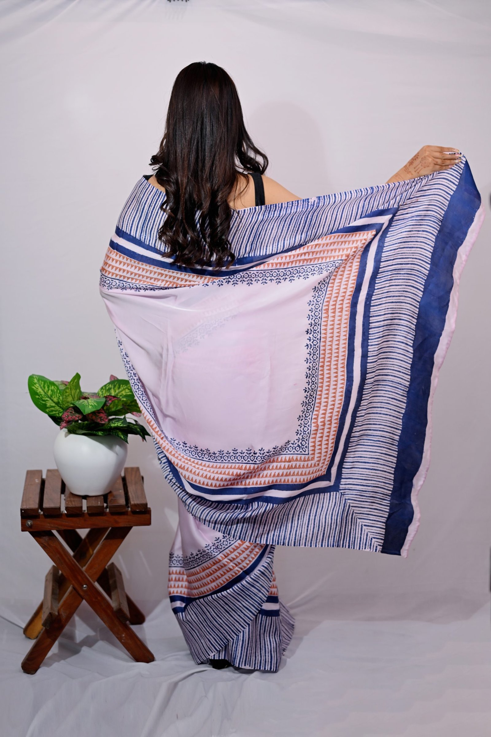Experience the elegance of traditional craftsmanship with the Dhari Modal Silk Saree, crafted in luxurious modal silk and adorned with hand block printed beautiful  geometric border motifs.  Each block is carefully printed by skilled artisans, making every saree unique and timeless.