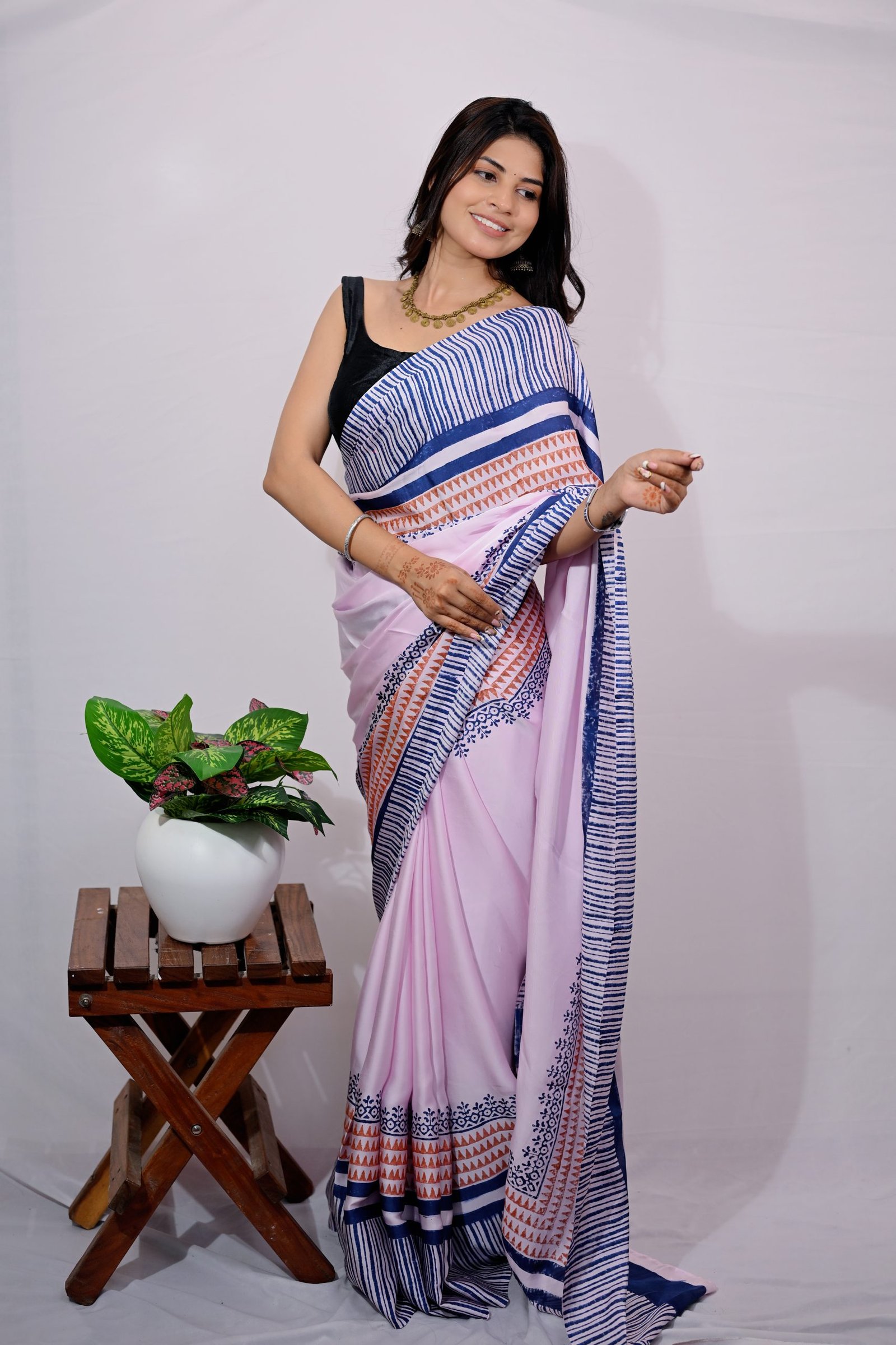 If you’re looking for a hand block printed modal silk saree, this Dhari Modal Silk Saree combines luxury fabric with artisanal craft. This traditional yet contemporary design saree reflects creativity, tradition and modern elegance. The saree is perfect for office wear, gatherings, evening party, cocktail party, get togethers and formal occasions.