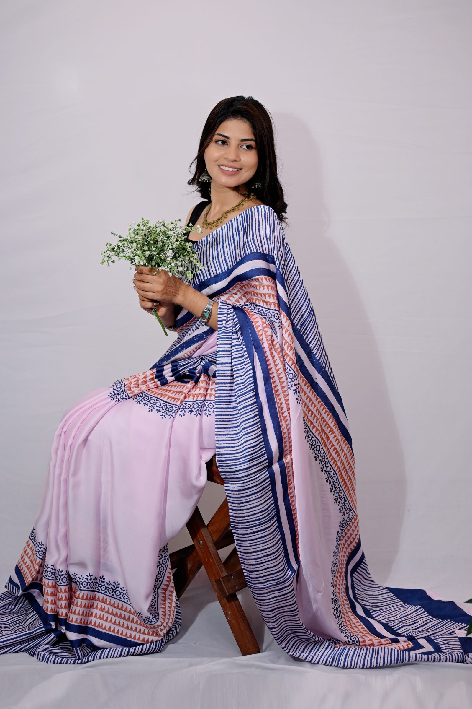 The  Modal Silk Saree has light pink base and is beautifully complemented with blue and Peach prints, giving the saree a beautiful grace. The vertical borders give an elegant pose to the saree. Designed in standard size with a matching blouse piece, it drapes gracefully and is ideal for festive occasions, weddings, office parties, or cultural gatherings.