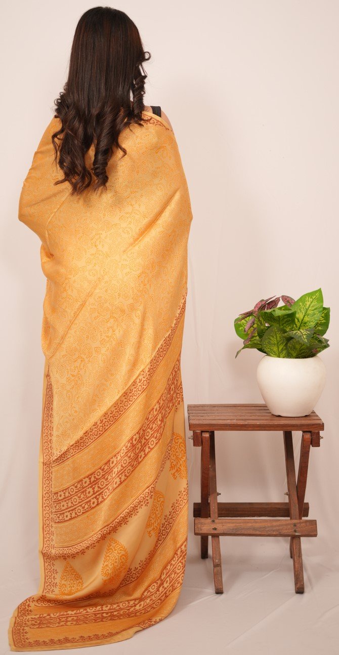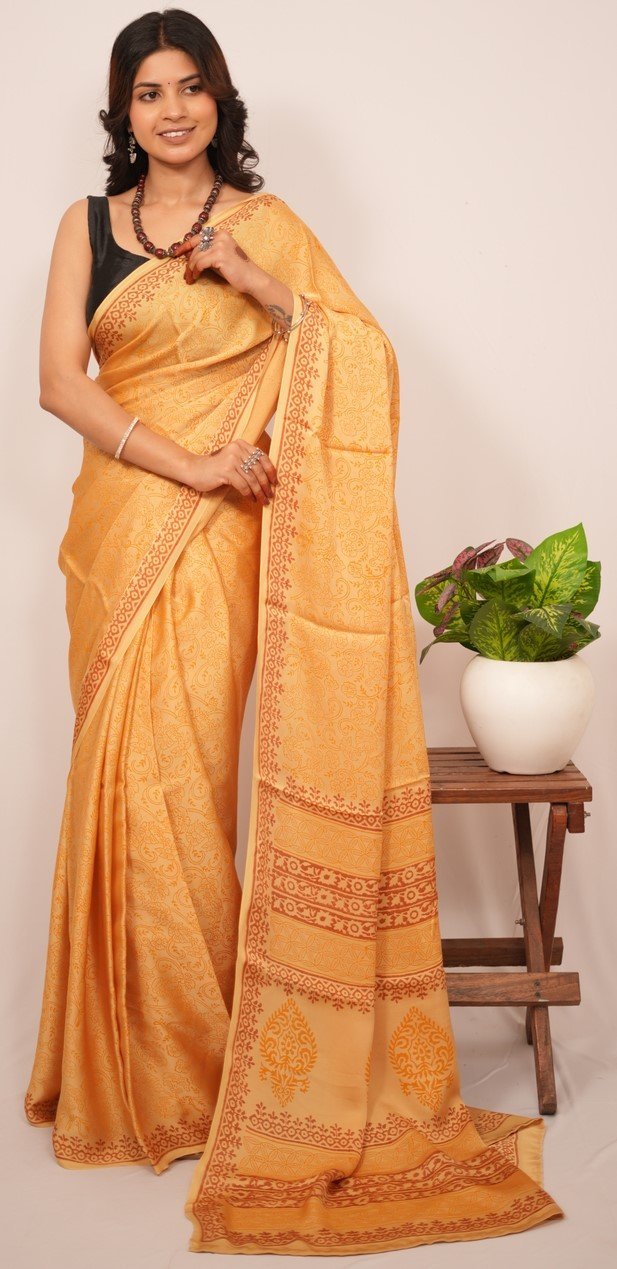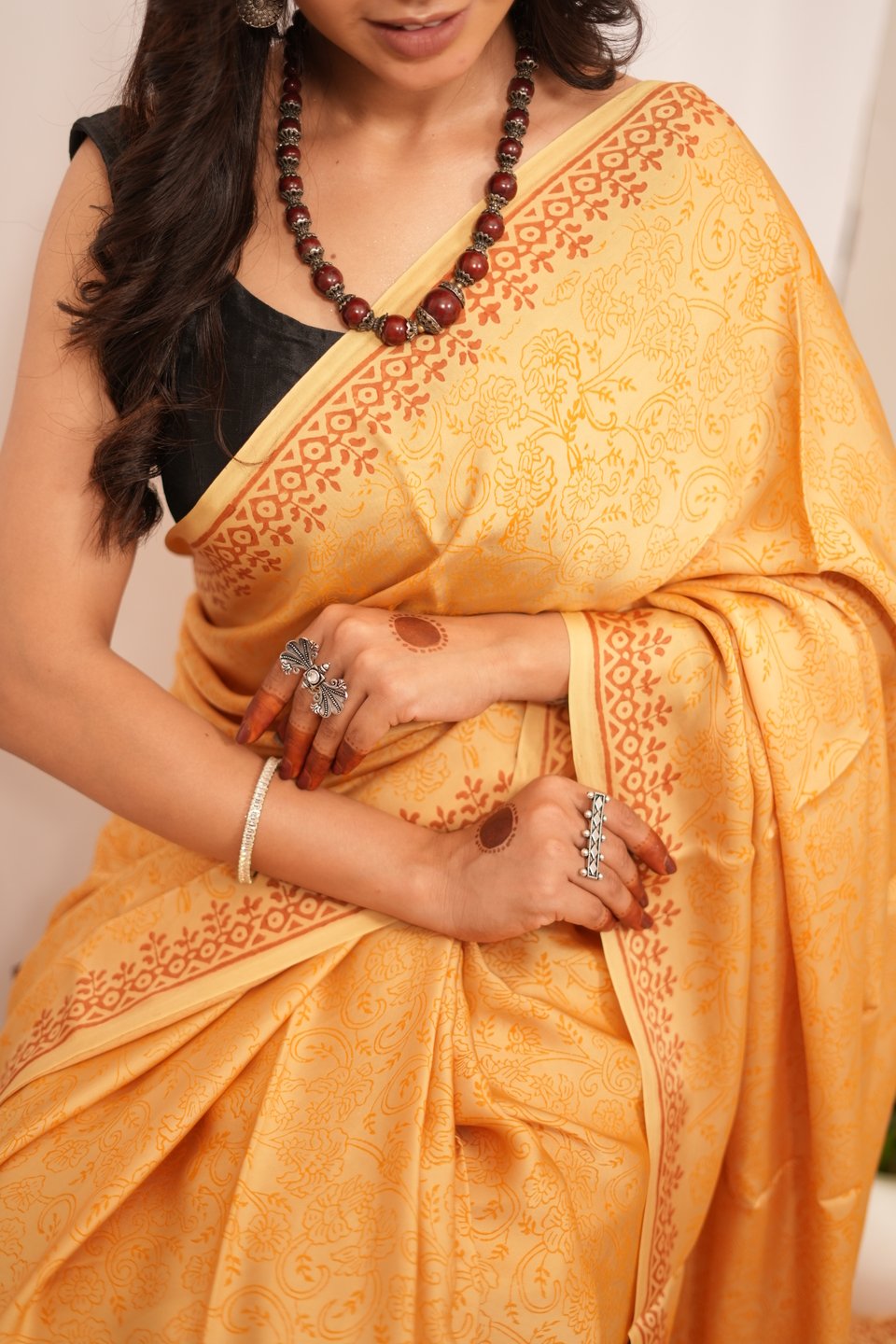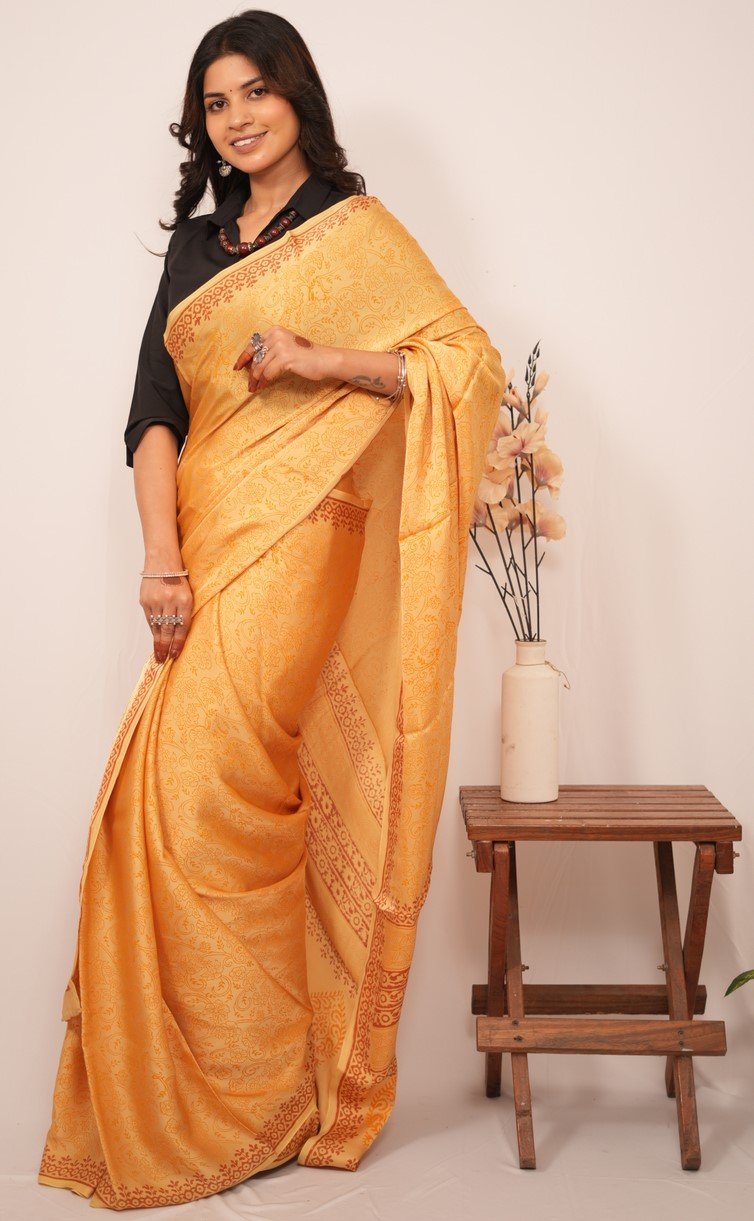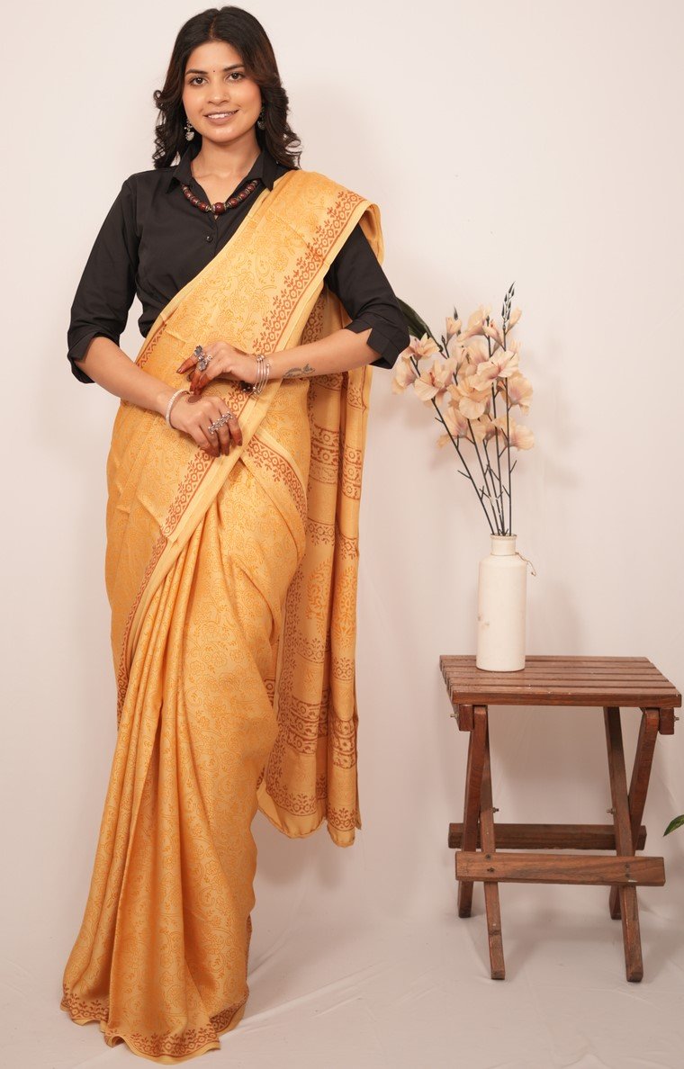 The Modal Silk Saree has peach nude base and is beautifully complemented with Yellow prints, giving the saree a beautiful and Devine elegance. Designed in standard size with a matching blouse piece, it drapes gracefully and is ideal for festive occasions, weddings, office parties, or cultural gatherings.