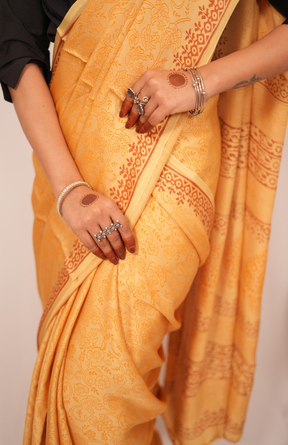 If you’re looking for a hand block printed modal silk saree, this smriti Modal Silk Saree combines luxury fabric with artisanal craft. It’s not just a saree, but a piece of art that reflects design, creativity and modern elegance. It has a beautiful inspiration of Madhya Pradesh. to give you a niche appearance. The saree is perfect for office wear, gatherings, evening party, cocktail party, get togethers and formal occasions.