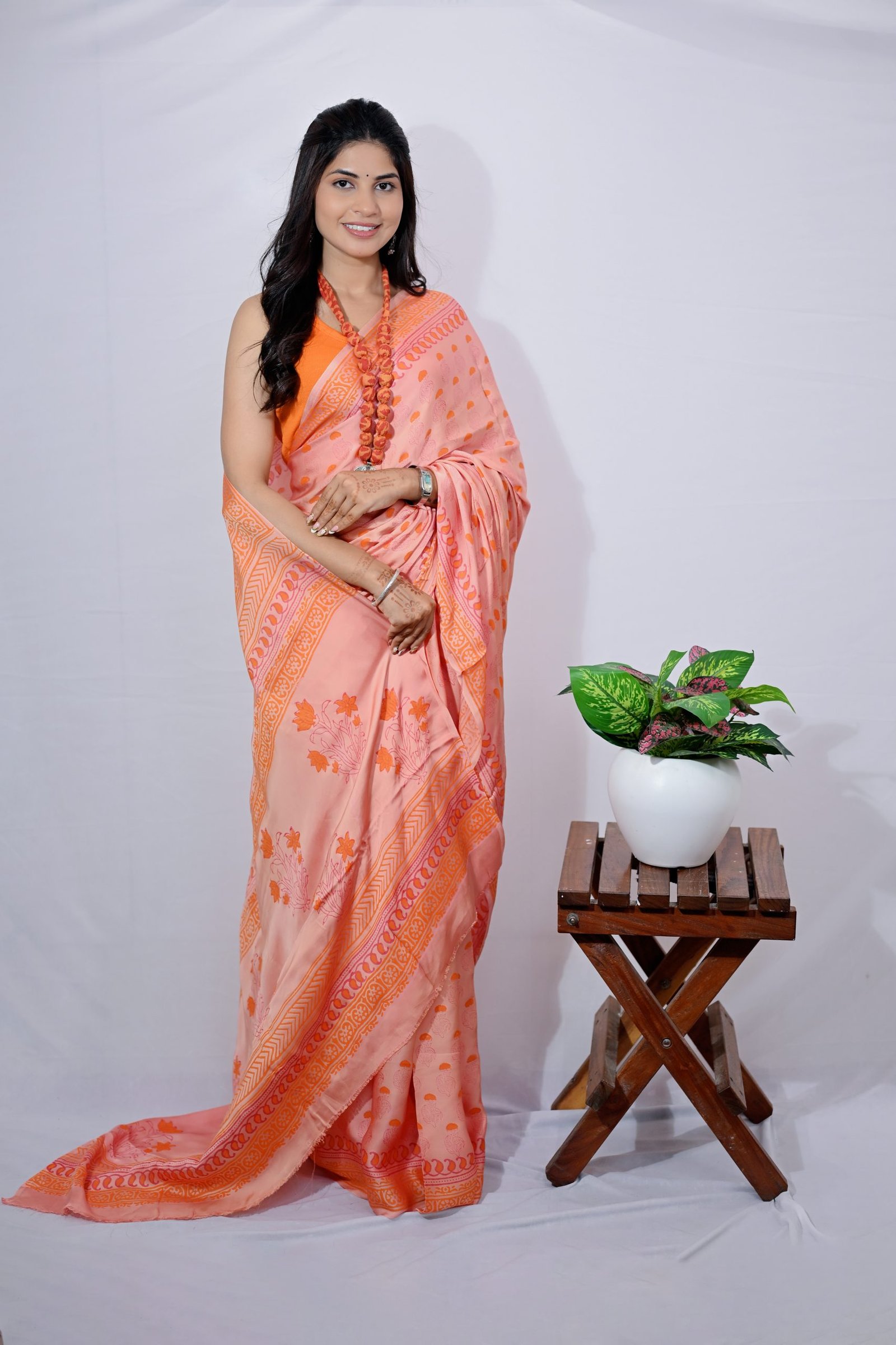 Experience the elegance of traditional craftsmanship with the Swarn Booti Modal Silk Saree, crafted in luxurious modal silk and adorned with hand block printed beautiful Swarn (orange is called as gold in synonym) Booti motifs.  Each motif is carefully printed by skilled artisans, making every saree unique and timeless.